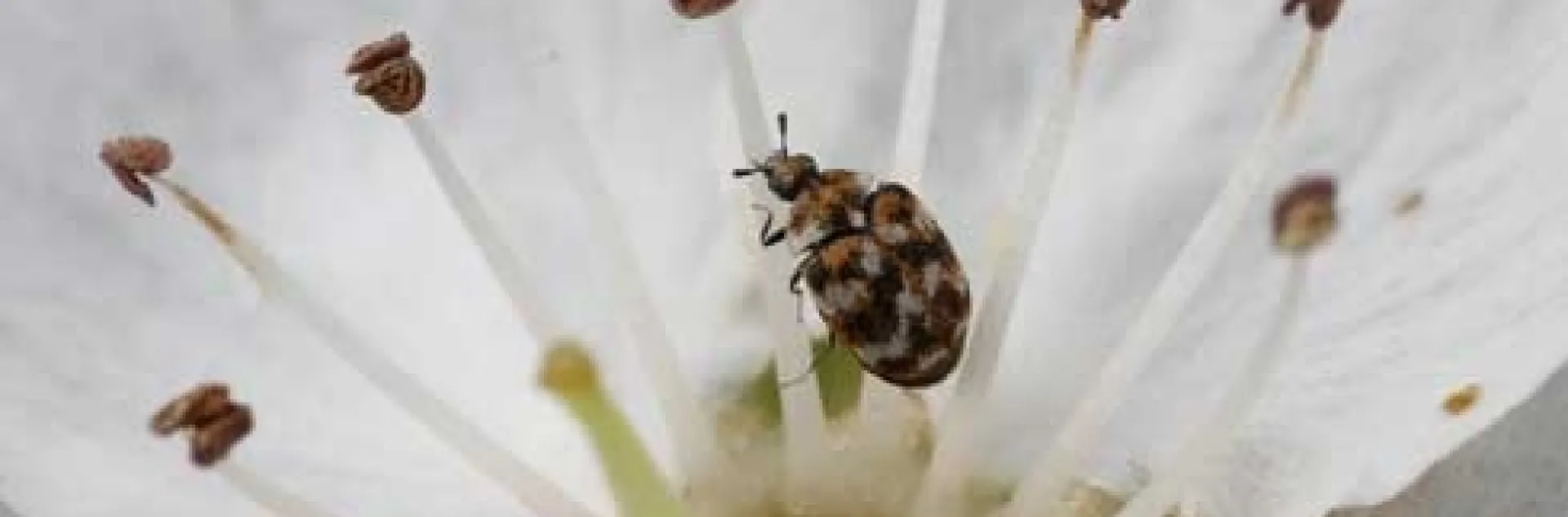 Carpet beetles are small insects that are common pests in homes, museums, and warehouses. The larvae cause damage to natural fabrics and stored food. The larvae are often as big or bigger as the adults and appear fuzzy. They feed in dark, secluded places on a wide variety of animal products, leaving brown cast skins and pellets behind.