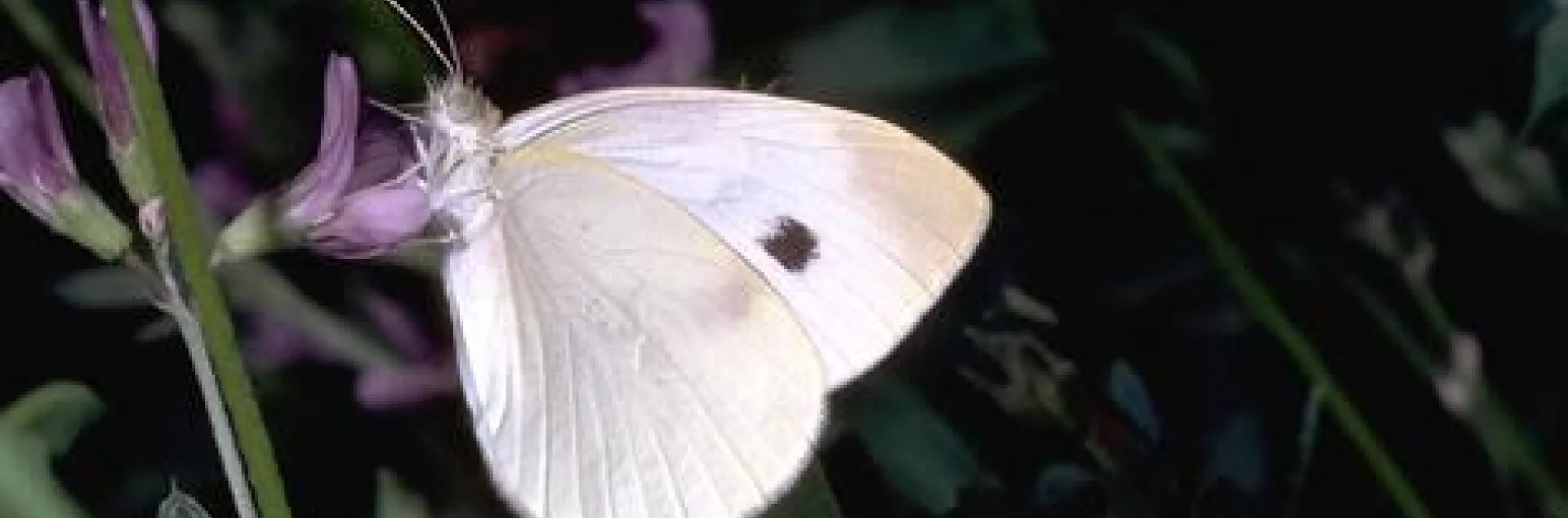 A white butterfly with a black spot on its wing feeding on a purple flower.
