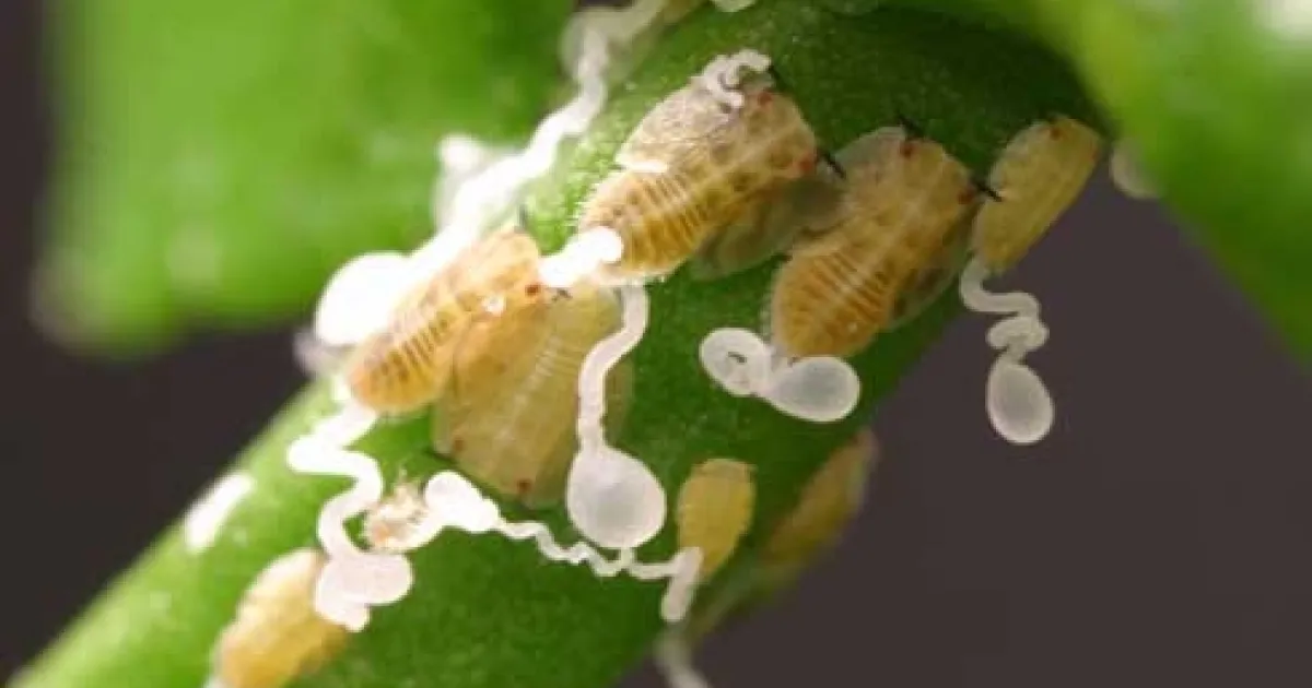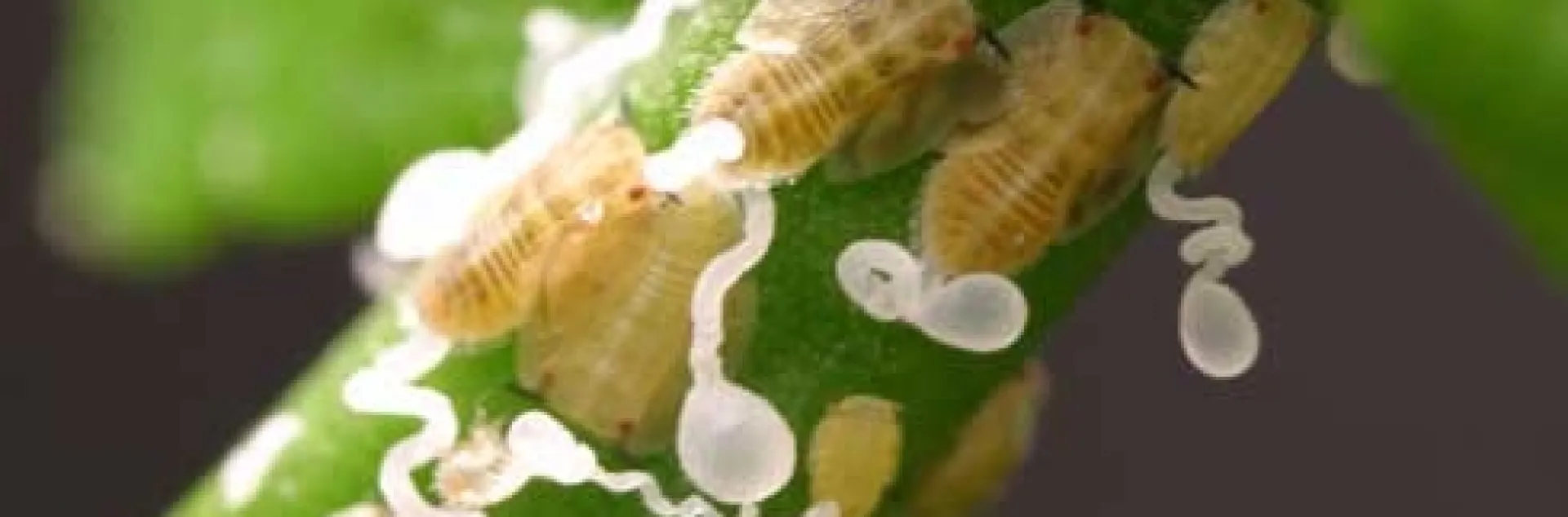 Asian citrus psyllid nymphs feeding on citrus can vector a serious plant pathogen that causes disease and tree death within 5 years.