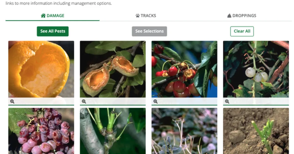 Animals can be pests in gardens and landscapes but often, you won't see them. Instead, you might see damage to plants or the ground, animal tracks, or droppings. UC IPM has a tool that can help you figure out what animal pest you have. The Wildlife Pest Identification Tool is a photo-based gallery of animal damage, tracks, and droppings. Once you've determined what animal is causing your problem, you'll be directed to information about biology and management for that specific pest. Access this tool here.