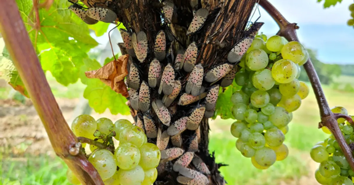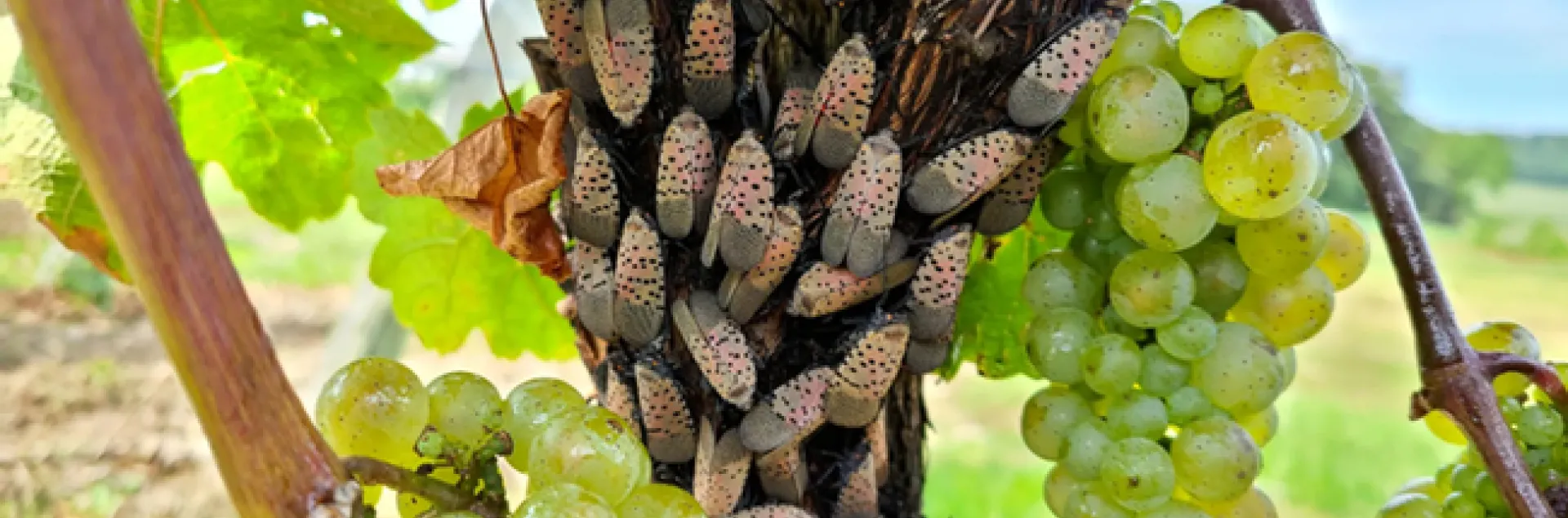 The spotted lanternfly (Fig. 1) is a sizable planthopper (about 1 inch long and about 0.5 inch wide) that originates from southeastern Asia. This planthopper has a wide host range consisting of 103+ plant species, with 56 feeding hosts identified so far in North America. SLF has caused economic damage to grapevines along with feeding on fruit trees (apple, cherry, fig, stone fruits), walnuts, blueberries, hops, oak, maple, birch, sycamore, ash, beech, hickory, poplar, willows, and woody ornamentals. Its preferred hosts are the invasive Tree-of-Heaven (Ailanthus altissma), grapevines, maple, and black walnut. SLF have piercing-sucking mouthparts and produce large quantities of honeydew that act as a substrate for the growth of sooty molds. In addition to being an invasive agricultural pest, SLF may also be a nuisance pest in urban areas due to their aggregation behavior.
