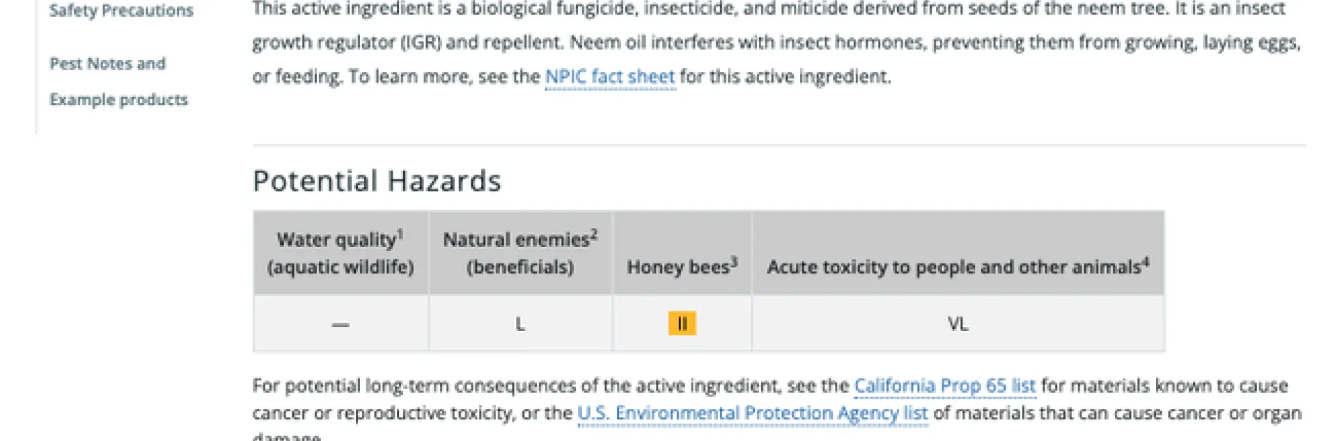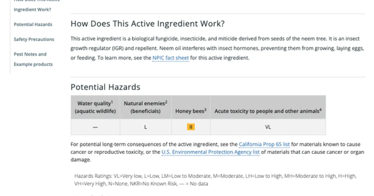 Each active ingredient in the database has its own page where you can learn what it is, how it works, and what pests it can control. You can also view example products available to the general public or licensed professionals, and a table displaying the potential hazards of the active ingredient. The potential hazards table includes toxicity information for water quality or aquatic wildlife, natural enemies, honey bees, and people or other mammals. A glossary of pesticide terms is available as well to help you understand pesticide terminology.