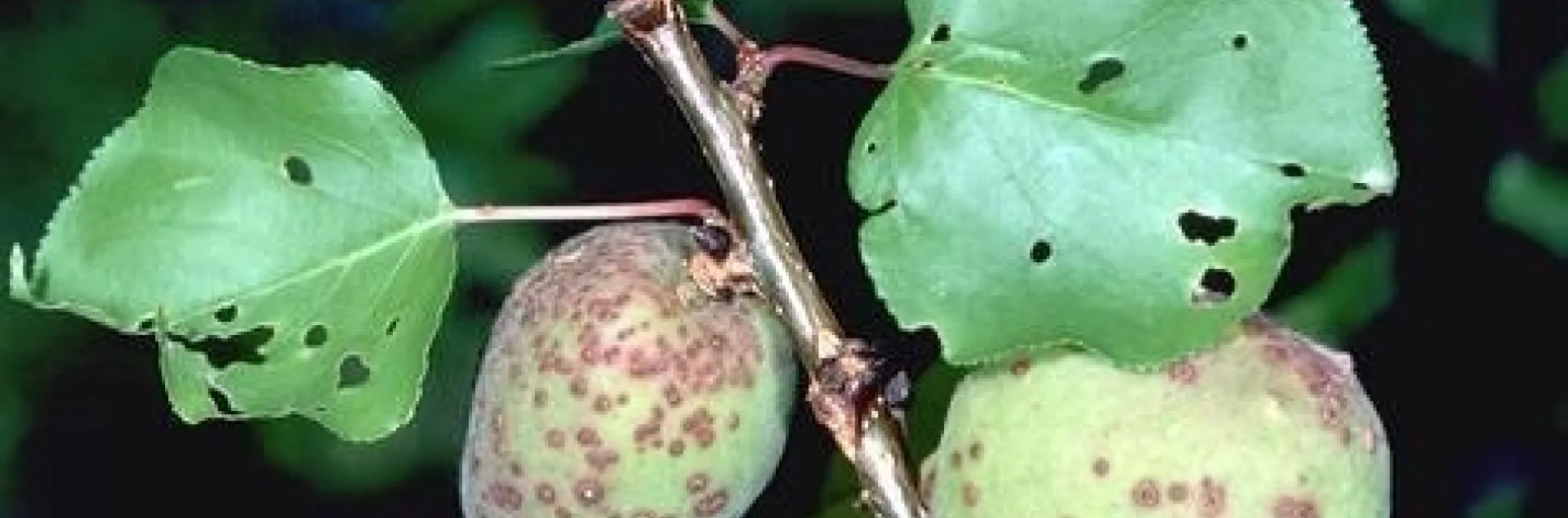Shot hole blight, also known as Coryneum blight, is caused by the fungus Wilsonomyces carpophilus. It affects almonds, apricots, and other Prunus species, as well as English laurel. Symptoms appear in the spring as small reddish spots that turn brown and drop out, leaving holes in the leaves (Figure 3). Fruit and twigs can also be affected. Since this disease is worsened by continuous leaf wetting, avoid irrigating foliage. For more information, see the UC IPM page on shot hole blight at http://ipm.ucanr.edu/PMG/GARDEN/FRUIT/DISEASE/shothole.html.