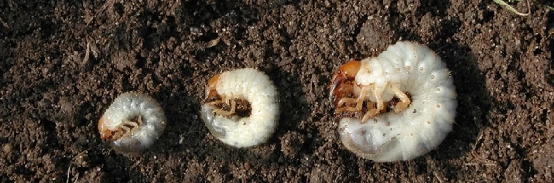 There are three species that feed on the roots of grasses, making them a potential pest to lawns when in high numbers. These species may also be found in landscape or garden beds that are near grassy areas or were recently converted from grassy areas. Compare the size of white grubs you may find, as some species are much larger or smaller than others and can help you determine which is present.