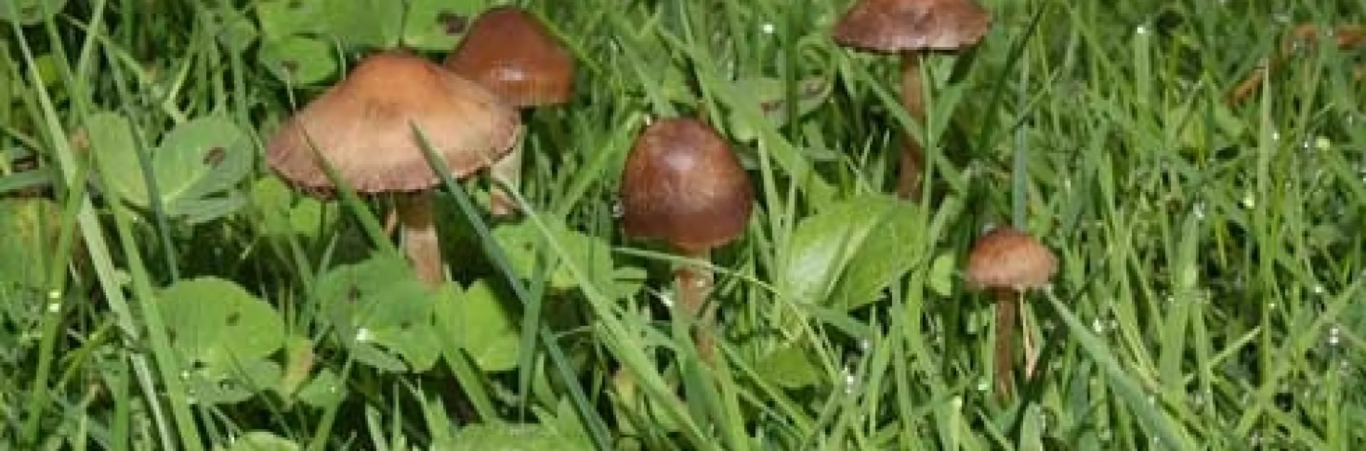 Mushrooms are the visible reproductive structures of some types of fungi. Picking or removing the structures can minimize the spread to a new site, but it won't kill the underground mycelia from which the mushrooms are growing. Mushrooms come in many shapes, sizes, and colors. Some common mushrooms in lawns are pictured below. You can find more information about mushrooms and what to do about them in UC IPM's Pest Notes: Mushrooms and Other Nuisance Fungi in Lawns.