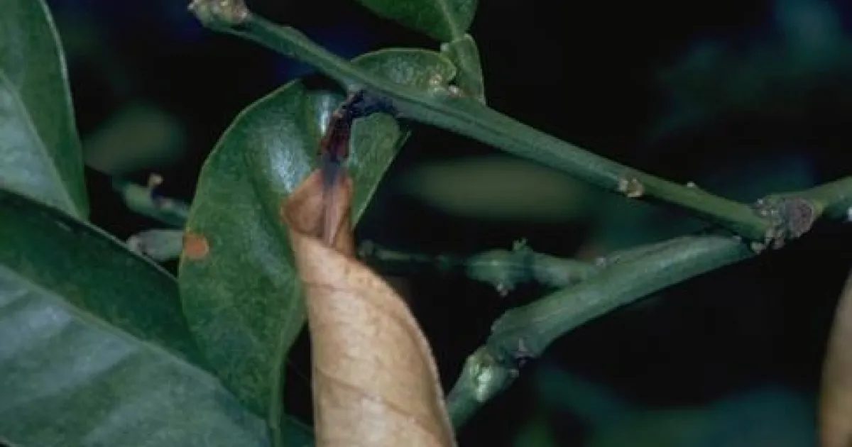 Cold, windy, rainy weather provides ideal conditions for the development of Citrus blast, a disease that affects many varieties of citrus grown in Butte County, including oranges, grapefruits, lemons and mandarins. Citrus blast is characterized by individual leaves that rapidly wilt, dry up, and die on the tree. The leaf stem turns brown and a brown lesion will form on the twig where the infected leaf is attached. The leaf blades may drop or remain stuck on the tree but the dead leaf stem (petiole) often remains attached to the twig. On young vigorous shoots the lesion at the base of an infected leaf may grow around the shoot, girdling the twig and causing twig dieback. On damaged twigs a reddish-brown crust will form over the diseased spot.