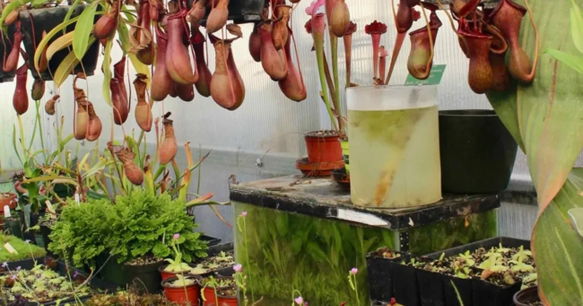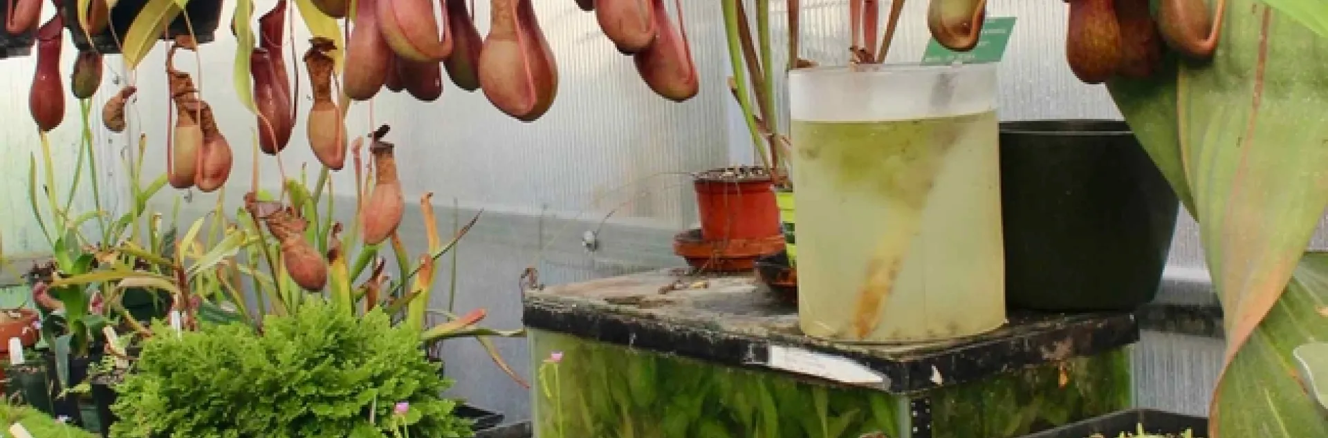 The first thing you notice when you enter the main conservatory building [O2] is the temperature. There are three distinct rooms, each representing habitats found throughout the natural world. Spiny, thorny cacti and succulents, crowd-pleasing carnivorous plants, and rare specimens like the odd, ancient Welwitschia mirabilis from Africa are found in the first room, along with other species that grow best in dryer, warmer conditions. Every part of the space is in use: plants grow on benches and up walls, hang from the ceiling, and trail along wires strung overhead. Tall, tree-sized specimens tower over other plants which taper down in size to the very smallest non-flowering plants such as mosses and liverworts (bryophytes).