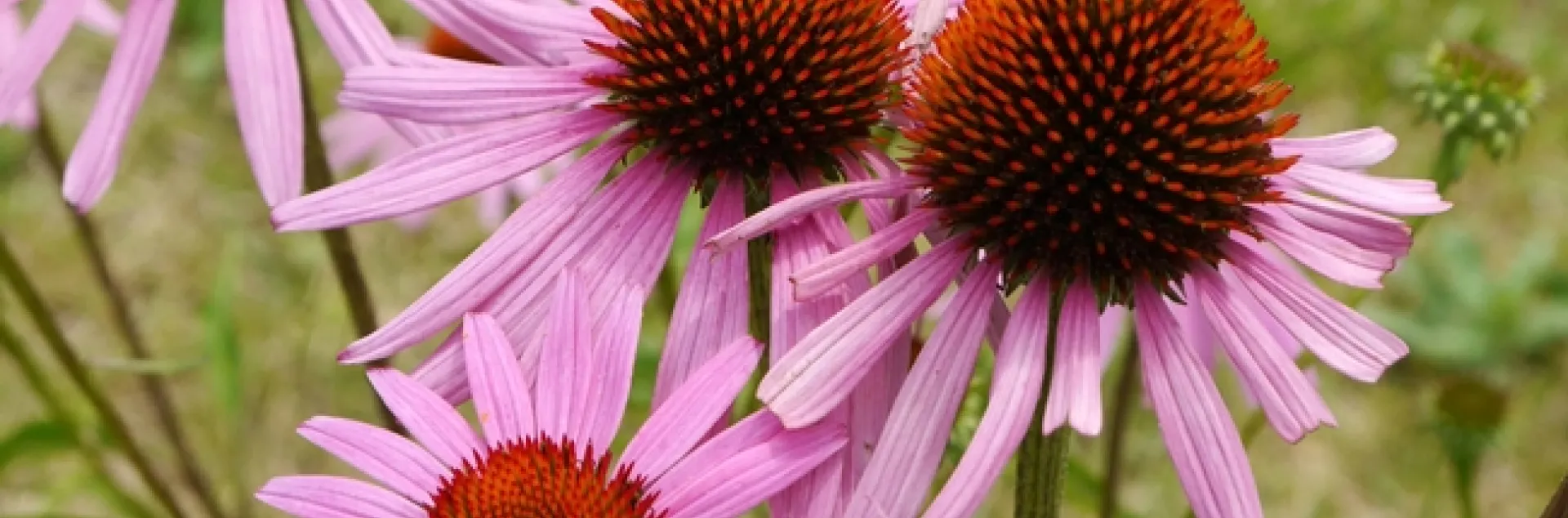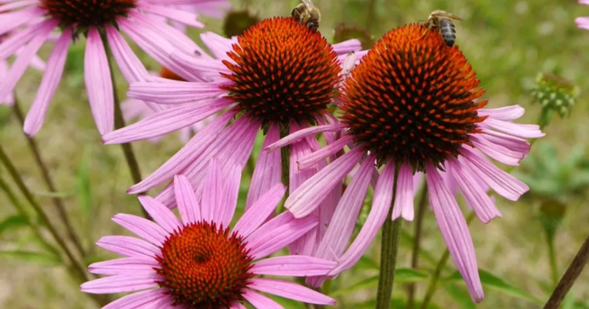 Echinacea is a tough perennial with brownish orange dome-shaped centers. E. purpurea (purple coneflower) can reach four or more feet in height and form a dense clump two feet wide. The four-inch flowers have purple ray flowers (petals) that droop downward. Situated in sun or part shade, these plants have a long blooming period, from June through August. They require well-drained soil and moderate to regular watering. Coneflowers require little in the way of maintenance other than dividing when they become overcrowded (about every four years). When dividing and re-planting, make sure each division has a shoot and roots. Coneflowers are self-seeders, and will multiply if happy. They attract bees, birds and butterflies; if the flowers are left on the plants, their bristly seed heads provide birds with food during the winter. Deer will eat the young plants but generally avoid mature ones. Coneflowers make good cut flowers and can be dried and preserved.