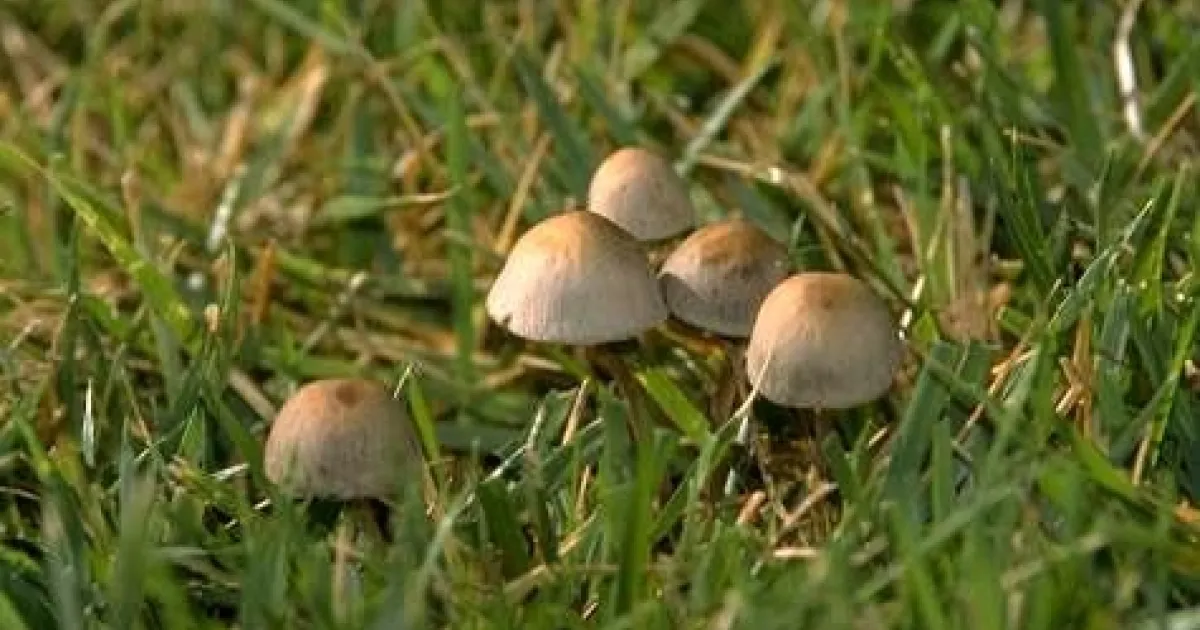 Decaying and healthy mushrooms of the common lawn fungus, Panaeolus foenisecii. Jack Kelly Clark, UC IPM