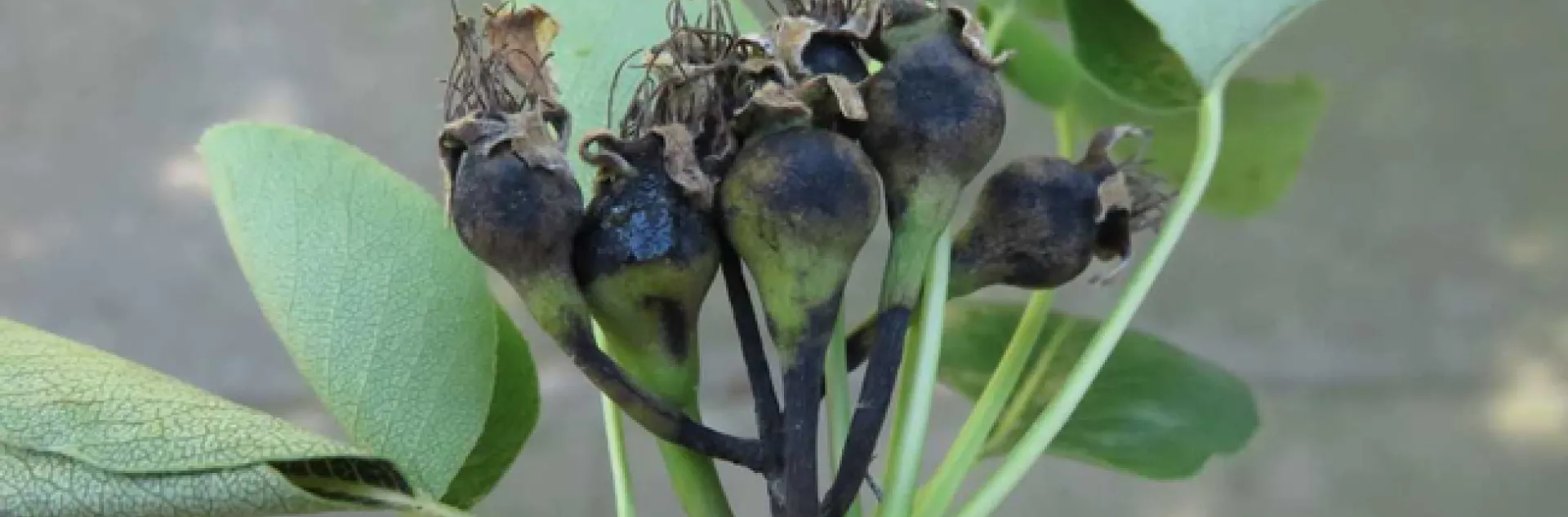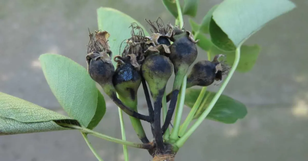 The first sign of fire blight is often blackening of flowers, shoots or leaves followed by a watery, light tan ooze from affected shoots. Open flowers are the most common infection site and remain susceptible until petal fall.