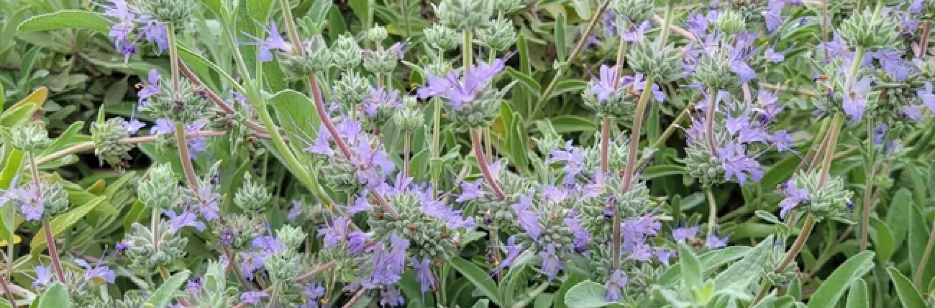 Creeping sage is an eight-inch-tall groundcover which spreads to form a patch eight or more feet across. It has gray-green leaves with blue-violet flowers. Native to the northern Coast Range and Sierra Nevada foothills; on the valley floor it does better with some afternoon shade.