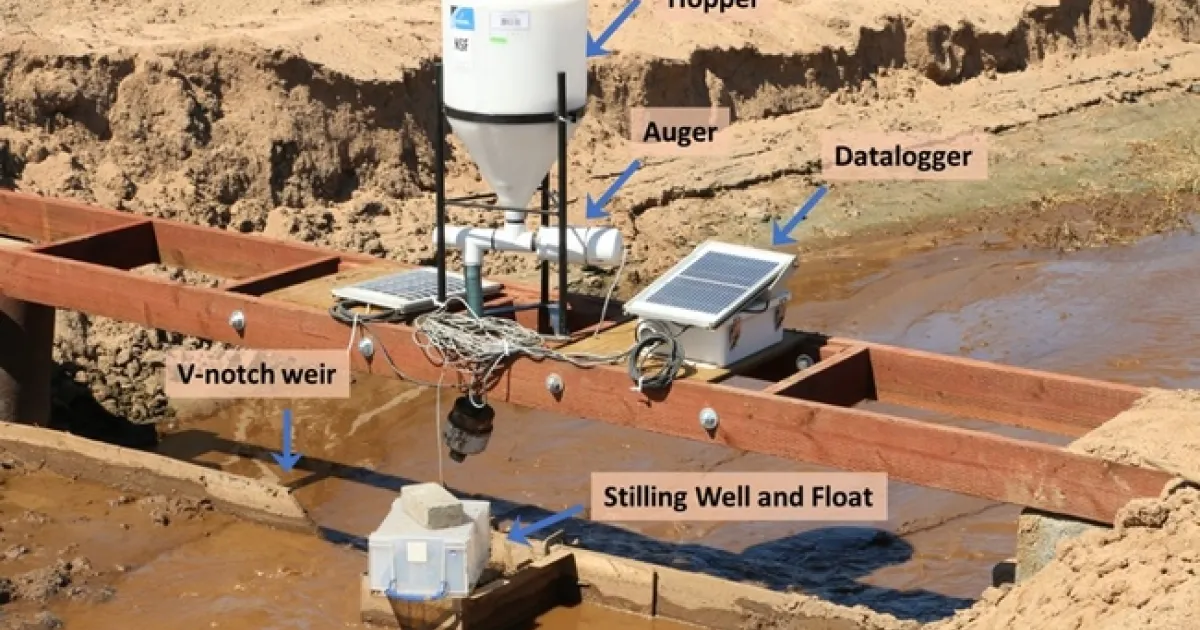 A second approach we developed for reducing suspended sediment in runoff is to use a smart applicator that can automatically apply dry PAM to the runoff water flowing in farm ditches. This type of applicator is suspended on a platform above a ditch and uses a hopper filled with dry PAM and an auger system controlled by an electric motor and small computer to drop PAM down a tube into the flowing runoff (Fig. 2). A weir and float mechanism located upstream are used to monitor the flow rate of the runoff so that the computer can adjust the frequency that PAM is applied. A video at this link demonstrates how the auger applicator operates.