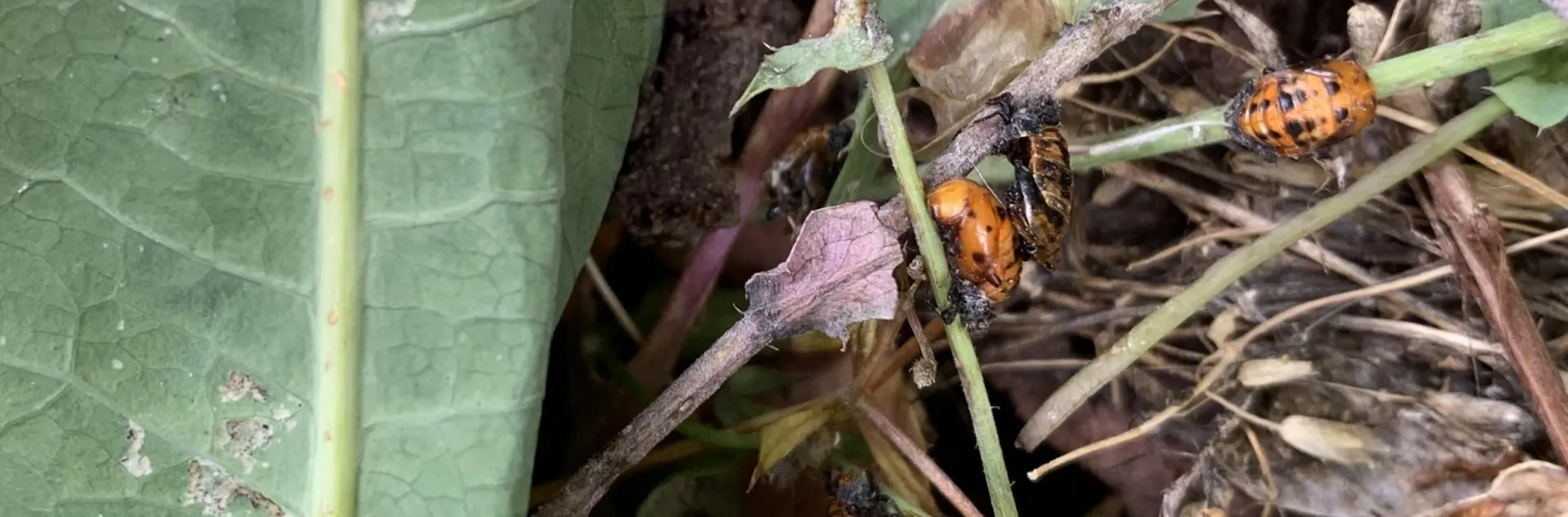 I inspect every weed for mobile lady beetle larvae and adults, and I relocate them to a patch of aphid-covered weeds that I will postpone pulling until last. When I spot the immobile pupae on weed leaf or stem, instead of tossing the whole weed into the municipal yard waste bin, I gently detach the affected plant part and tuck it under and amongst the weed patch I’m saving, now affectionately named my “lady beetle nursery.” And just to be sure, I leave my yard waste bin in the shade with the lid open so that any adult or juvenile lady beetles I accidentally toss into the bin can eventually find their way out.