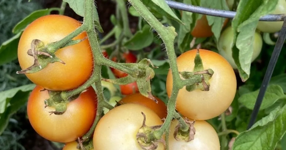 Most of its fruit show signs of solar yellowing caused by high temperatures (above 85 degrees F) accompanied by high light intensity. The normal red coloring of a tomato is lycopene. This fails to form at 86 degrees F, leaving carotene, which is either yellow or orange, as the sole fruit coloring.