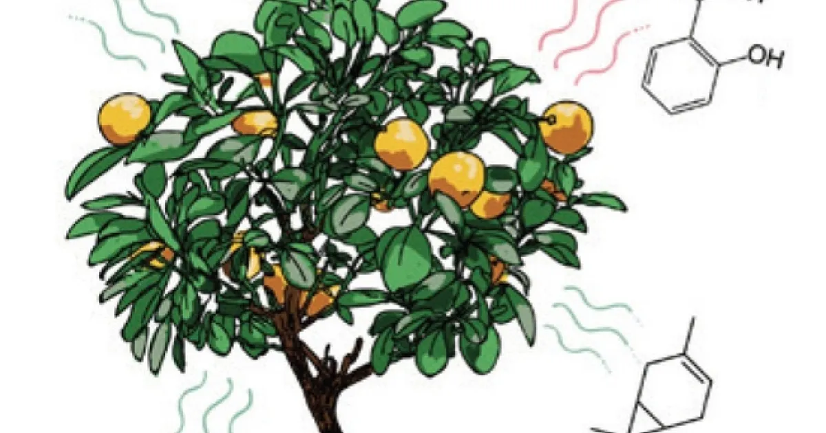 Citrus trees emit volatile compounds, or odors. HLB changes these odors.Citrus trees emit volatile organic compounds (VOCs), or odors, that are the end products of plant metabolism. Researchers can measure the VOCs emitted by a plant and create an “odorprint”. Pathogens, such as the bacterium CLas that causes huanglongbing (HLB), affect plant metabolism and alter the odor profile of the plant. Thus, the odor profile can be used to detect HLB-infected trees.