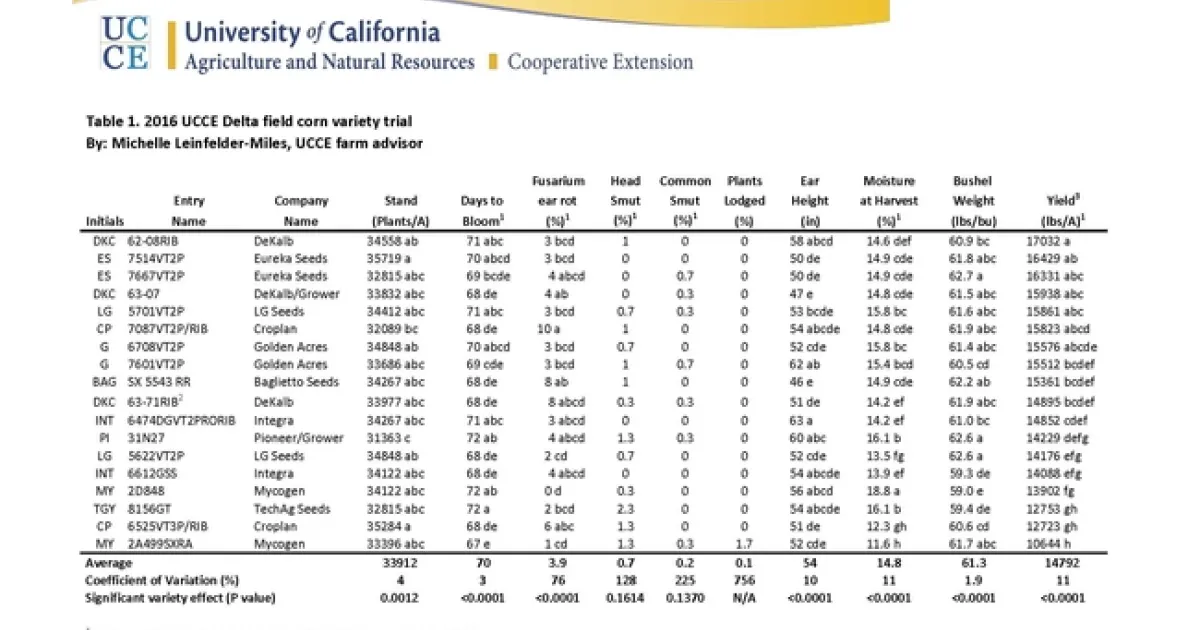 Table 1 shows the results of the 2016 UCCE Delta field corn variety trial, located on Tyler Island. Three replicate blocks of eighteen varieties were planted on April 27th by air planter. The eighteen varieties included 16 varieties submitted by seed companies and two varieties submitted by the grower. All varieties supplied by the seed companies were glyphosate-tolerant varieties. Each plot consisted of four 30-inch beds on an average row length of 1158 feet. Seed was planted approximately two inches deep and six inches apart down the row. The soil is a Rindge mucky silt loam with approximately 20 percent organic matter in the top 15 inches of soil. The Rindge series is a mucky peat soil down to about 60 inches, and approximately 55,600 acres in the Delta are described by the Rindge classification. The previous crop in the field was wheat. Subsurface irrigation by “spud ditch” was employed three times. Nitrogen was applied preplant (125 units/acre as NH3), and 34 gallons/acre of 8-24-6 with ½% of zinc was knifed in at planting. Weed control was by cultivation and herbicide application (Steadfast, Shark, and No Foam A adjuvant). Zeal miticide was applied. The field was harvested on October 10th.