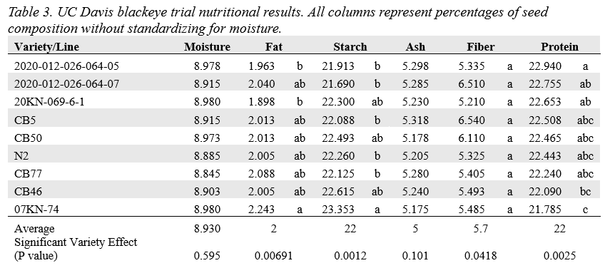 In Table 3, varieties are sorted by protein. There were significant differences among varieties for fat, starch, and protein. 07KN-74 had significantly higher fat than a couple of the newer advanced lines and statistically higher starch than most of the other material. It had, however, the lowest protein of all varieties. Together, these results support plant breeding efforts to bring high-yielding, pest resistant varieties to the market to support the California blackeye bean industry.