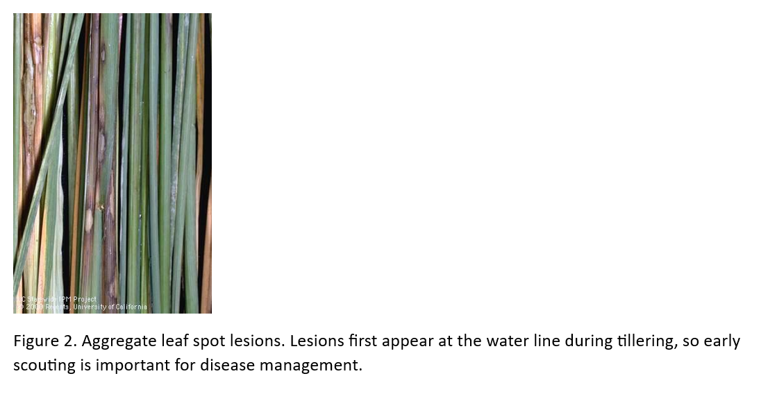 Disease Observations: I did not hear much about diseases this year. I only submitted one sample to the disease diagnostics lab at UC Davis, and they diagnosed aggregate sheath spot (Figure 2). Aggregate sheath spot is similar to stem rot because both diseases can be made worse by low potassium (K) conditions. Potassium can be limiting in some Delta soils, so proper plant nutrition is a good disease management strategy. UC Rice Specialist, Bruce Linquist, wrote this fact sheet about managing K. If soil extractable K is less than 60 ppm, K is deficient, and if extractable K is between 60 and 120 ppm, K fertilizer would likely be beneficial. Growers who have observed aggregate sheath spot or stem rot may benefit from testing their soil for K. If K fertility is sufficient and aggregate sheath spot or stem rot are still observed, fungicide treatment is also an option. It is important to scout at late-tillering and early-heading because treatment is most effective when applied between late-boot and early-heading.