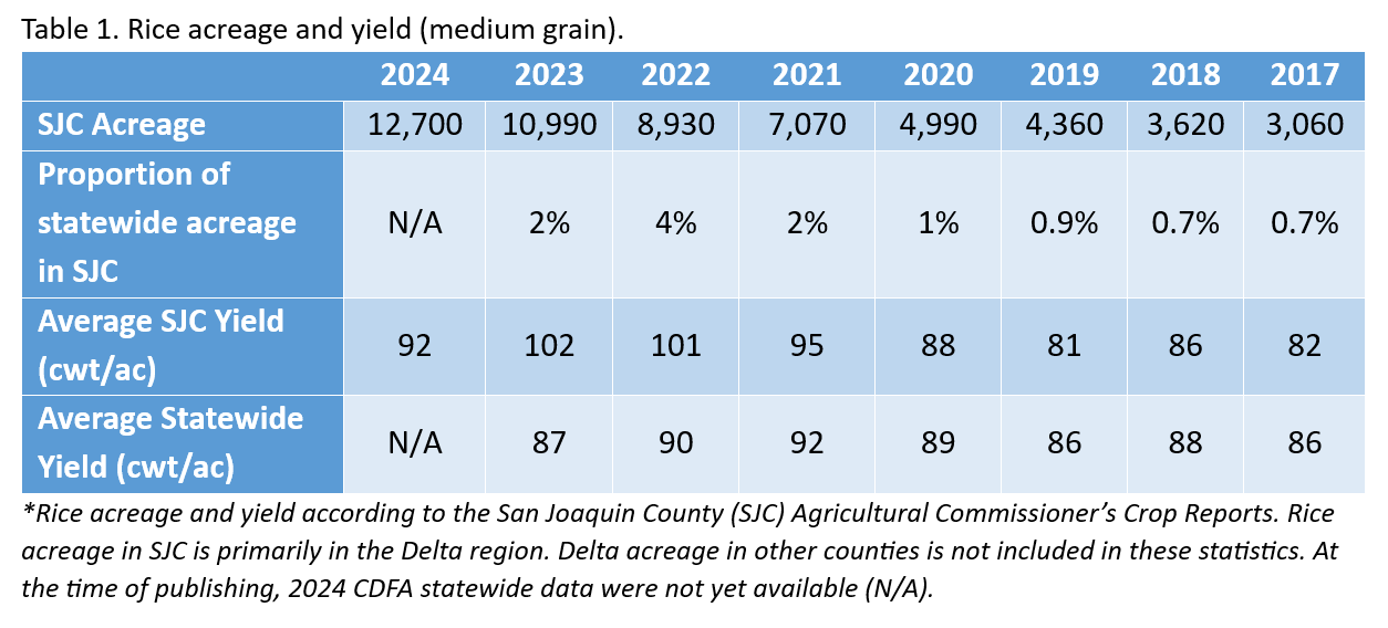 Variety Trial: Delta rice acreage has been steadily increasing, and yields are comparable with the statewide average (Table 1). I estimate that Delta acreage approached, if not exceeded, 15,000 acres in 2025. To support the growing industry, UCCE collaborates with the California Rice Experiment Station to evaluate commercial varieties and advanced breeding lines. The San Joaquin County Delta was one of eight locations in the 2025 statewide trial. The Delta is the only drill-seeded site and is a test site for very-early maturing varieties because it has cooler growing conditions than other rice growing regions of the state. Variety trial results will be available in the February 2026 newsletter.