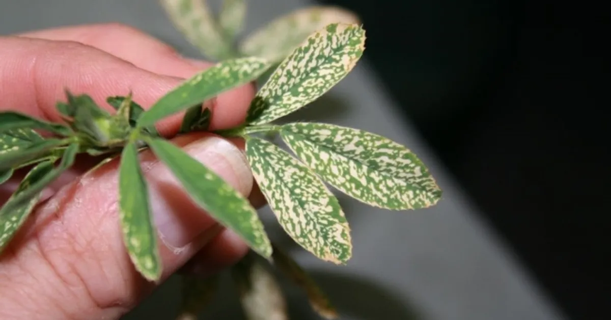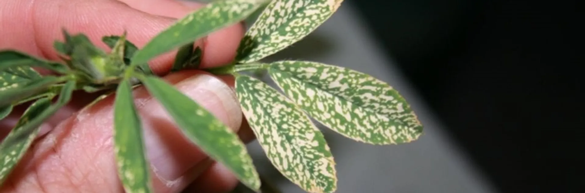In late August, I was requested by a crop consultant to visit an alfalfa field in the Delta that was exhibiting symptoms like those in the picture. The leaves had little white spots near the margins, and generally, the plants had not grown well after the previous cutting. These symptoms are characteristic of potassium (K) deficiency. Delta soils are often deficient in K, so the consultant was going to follow-up with a soil nutrient test.
