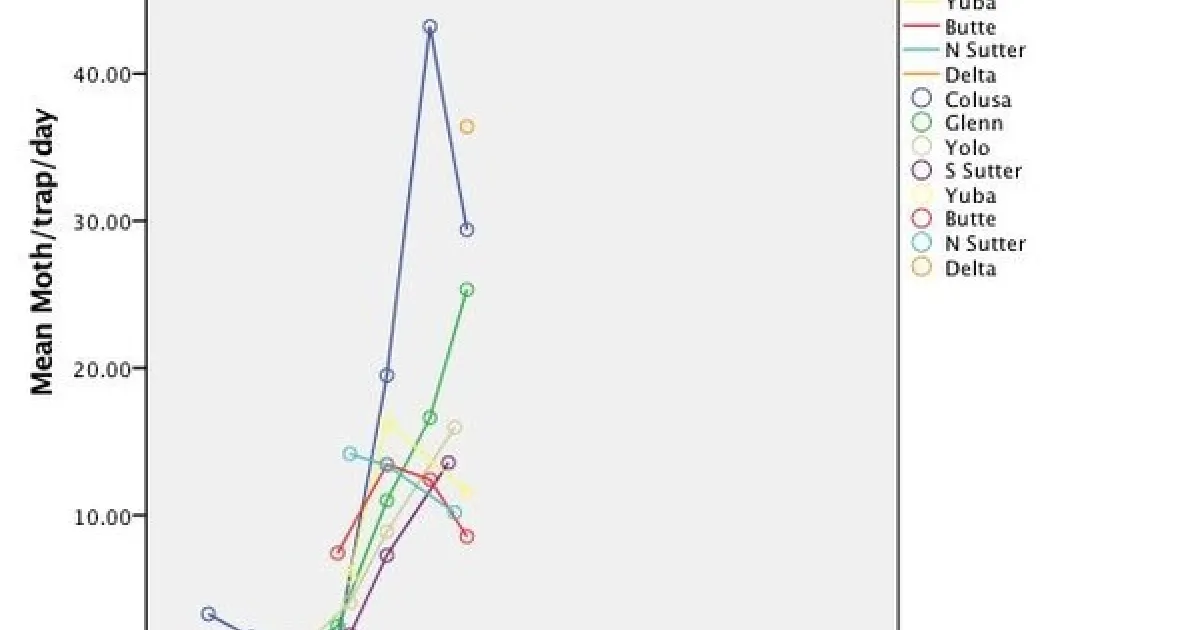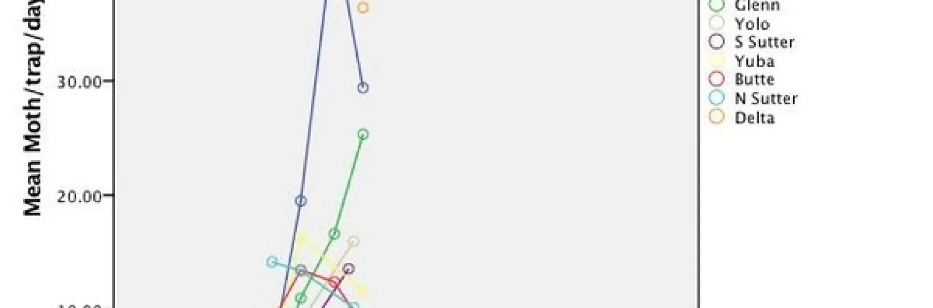 UC Cooperative Extension has augmented efforts to monitor armyworm populations in rice fields since 2015 when we observed large populations earlier in the year (June) than previously observed. Here in San Joaquin County, we began monitoring in Delta rice fields a couple weeks ago. We are cooperating with rice farm advisors in the Sacramento Valley to get a more comprehensive assessment of the populations. Figure 1 shows moth counts from last week. The Delta count is the single orange data point at about 36 moths/day. Compare that to the Sacramento Valley where there have been similarly high moth catches in Colusa and Glenn counties.