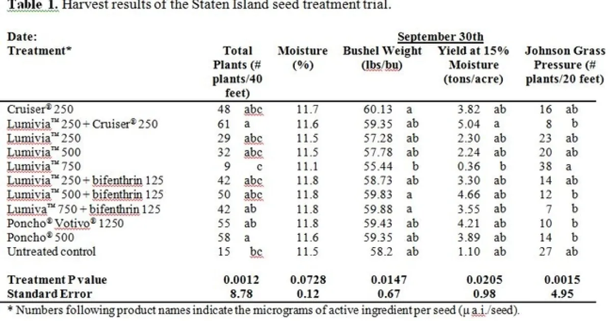 Growth results are described in the online report. Yields at the Staten Island trial were highly variable, and both wireworm and weed pressure may have contributed to the variability (Table 1). Johnson grass pressure was especially high in treatments where plant stands were compromised by wireworms or birds. High weed pressure can be a consequence of poor wireworm control because stands that are compromised do not provide the consistent shading to out-compete weeds. Yields can suffer as a result. The Lumivia™ + Cruiser® treatment yielded the highest, and Lumivia™ 750 yielded the worst, even lower than the untreated control. The poor result of Lumivia™ 750 may be explained by uncontrollable factors, namely, bird damage and high wireworm pressure. The polymer treatments that were tested at the Tyler Island site showed no yield benefits over the non-polymer treatments and yielded similarly to the commercial standard, Poncho® Votivo® (Table 2).