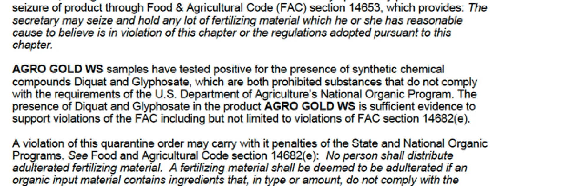 AGRO GOLD WS, Co-packed with Weed Slayer, Found to Contain Both Diquat and Glyphosate