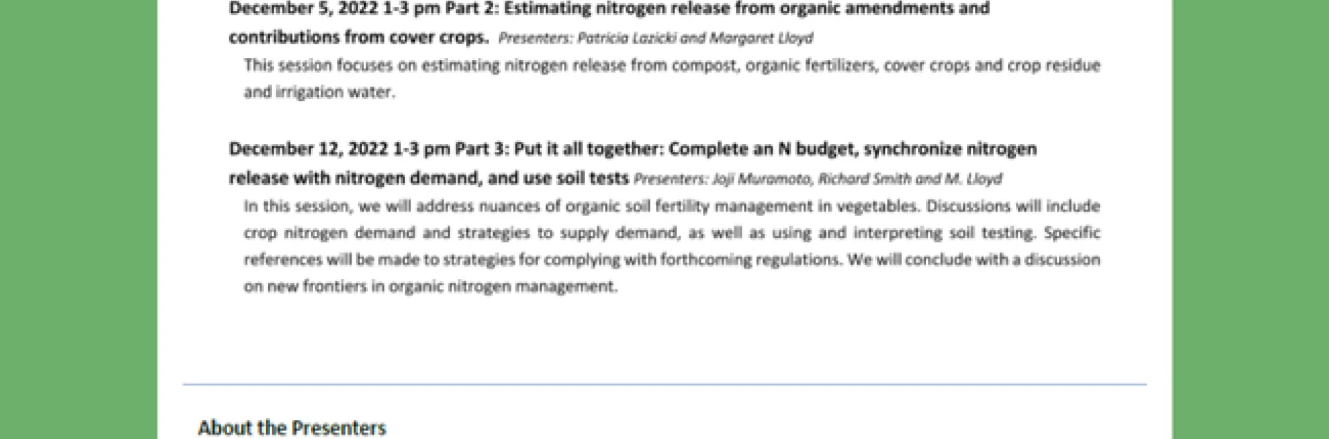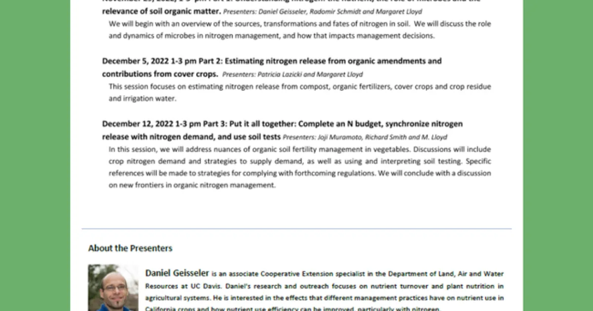 November 16, 2022 Print Practical Training on Nitrogen Planning and Management in Organic ProductionThree Part Workshop (Nov. 29, Dec. 5, Dec. 12) 1PM-3PMCLICK HERE TO REGISTERDownload Flier