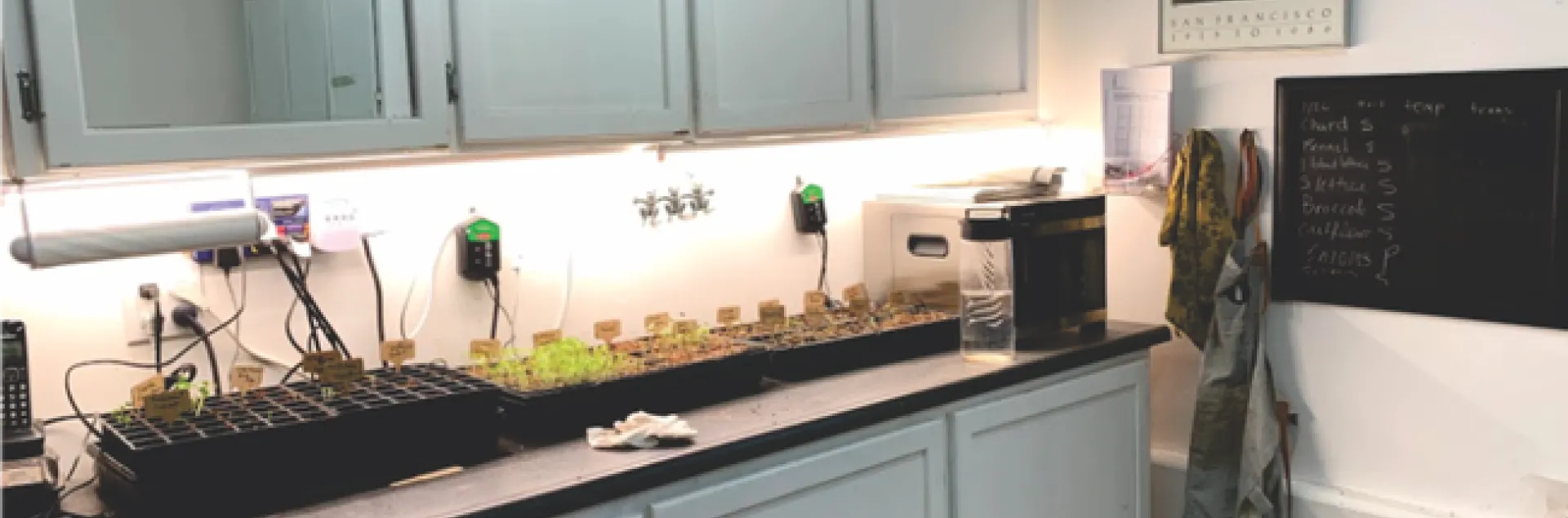 With seed starting in mind, I created a section in my garage (the HER's side) with left-over cabinets from our remodel. I started by removing anything inside the cabinets that was not related to gardening. This left a pile on the HIS side, and things got organized pretty quickly. To further organize my seed planting practice, I painted a blackboard so I can glance at dates for sprouting, replanting, harvest. There is also a column for what type of medium is used – seedling starter or soil, this being something that has confused me in the past. I keep a cooking apron, scissors, a potting spade, pencil, chalk for the chalkboard, labels, indelible markers, and other handy tools nearby so I don't have to waste time looking for those tools when I need them.