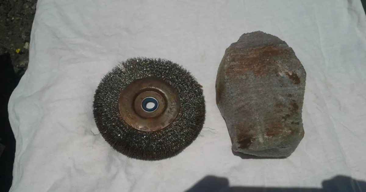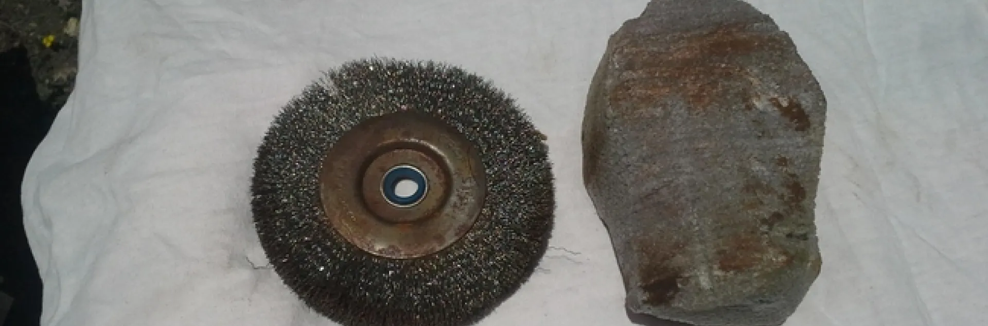 Every tool is cleaned and dried sap, soil and any rust is removed from the metal surfaces using the sandpaper, wire brush and steel wool. Stubborn spots are hit with the pumice stone and rotary wire brush.