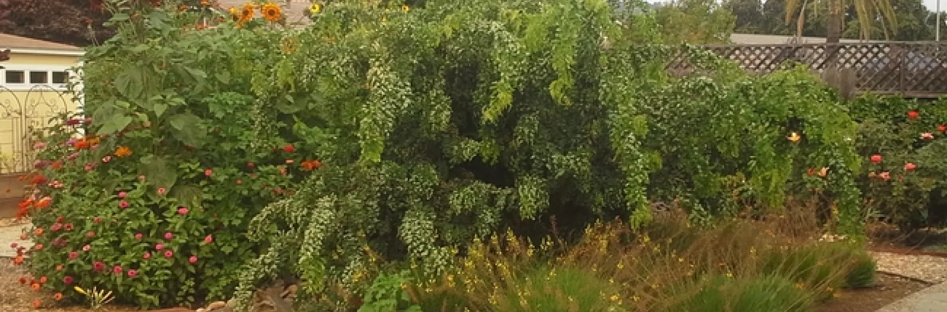 The fall of 2021 was our first year of fall maintenance. I use the words ‘installed' instead of ‘completed' because, in the words of a wise UC Master Gardener friend, “a garden is never completed, it evolves.” I have mentioned my preference for deciduous trees because they have set times for debris dispersal. Evergreen trees seem to be a constant maintenance issue with their leaf, flower, fruit and bark debris dropping on a continual basis. As a result, our trees are deciduous, but the shrubs are either evergreen or deciduous, depending on where they are in the landscape. The plants are chosen for their constant color and coverage. They have been working all summer producing their various raisons d'être: regular flower production for pollinators and ongoing green leaves that cover and protect the soil while providing constant color. Each of these plants has some basic maintenance, but not too much, keeping with our low-maintenance theme.