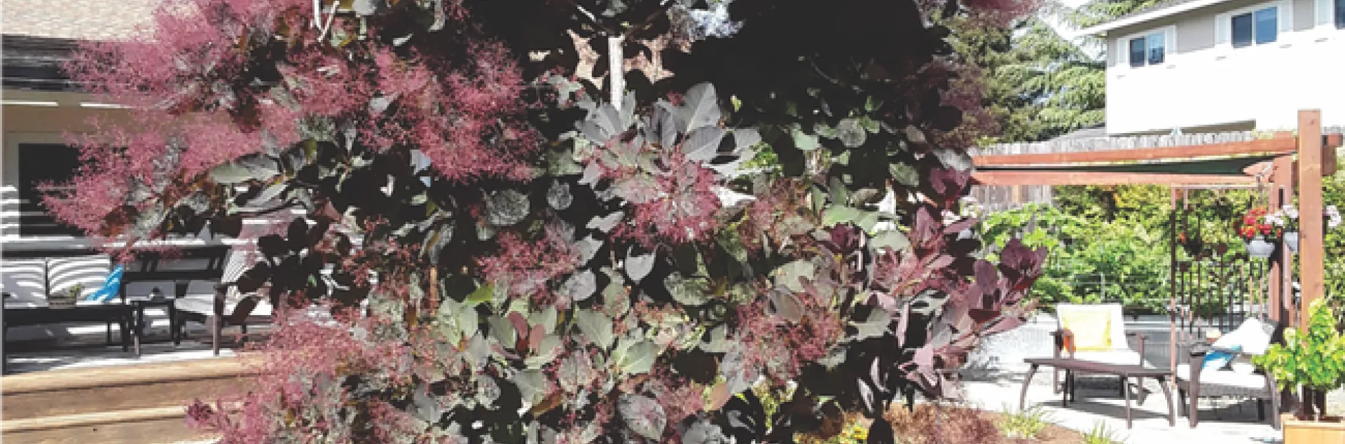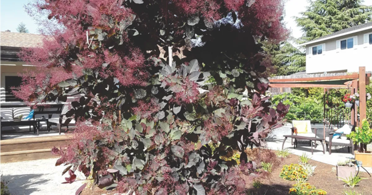 Last year we removed our pool and put in a free form garden. It was lots of work but we feel it was well worth the effort. In choosing the trees for the main anchors of our new landscape we wanted larger mature trees so we would have a sense of establishment and maturity right off the bat, but we really weren't sure of which trees to select. We now feel the smoketree or smoke bush tree was one of the best “seat of the pants” decisions we ever made for our garden.