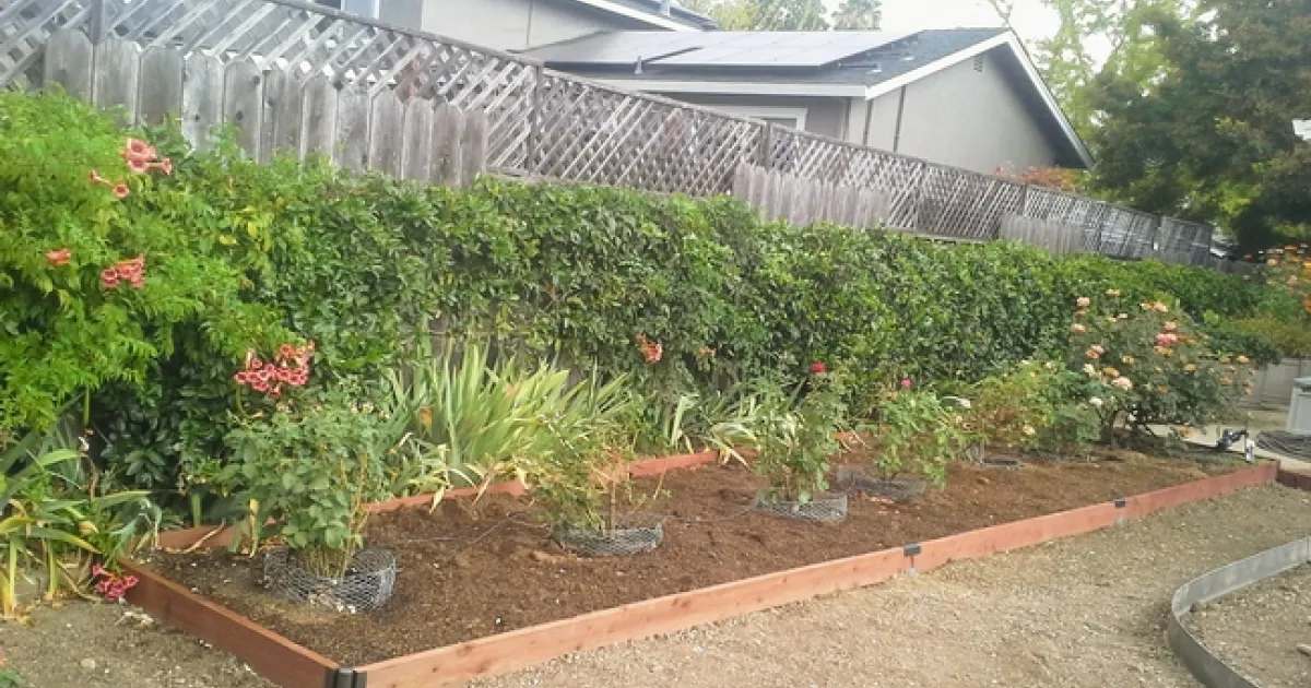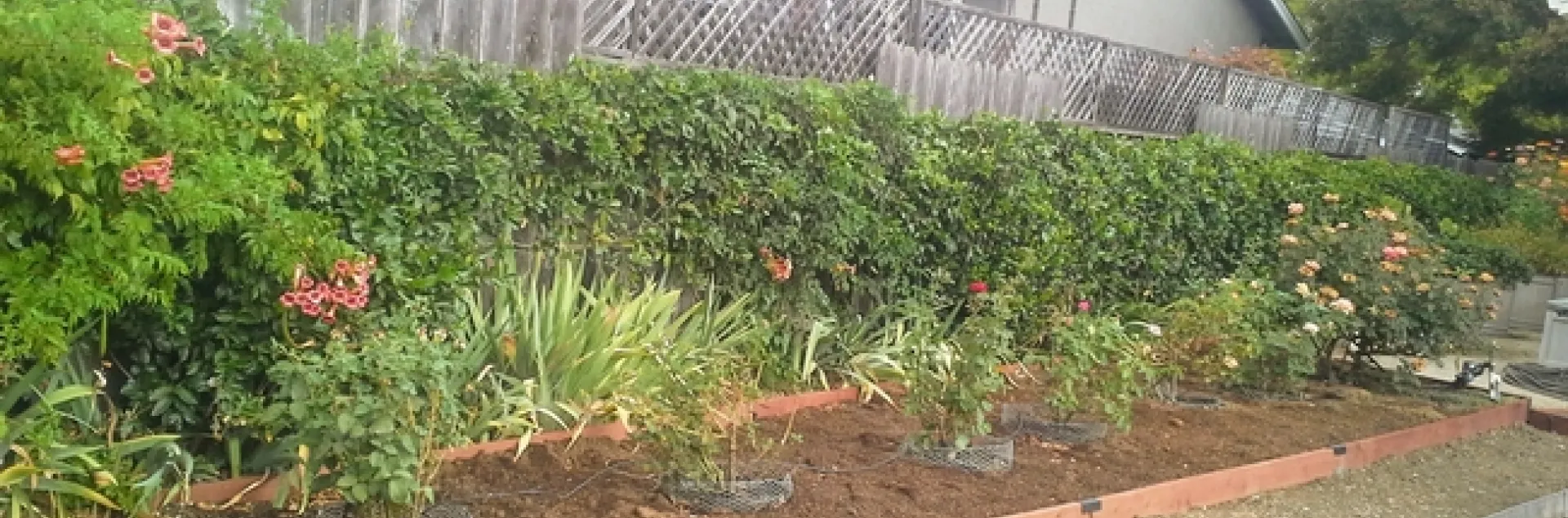 The new trees we planted and the roses that we transplanted are doing very well and seem to enjoy their new locations.  We have since installed irrigation in the rose garden, surrounded the area with a 2x6 raised bed and filled it with amended soil. It looks wonderful, I must say.