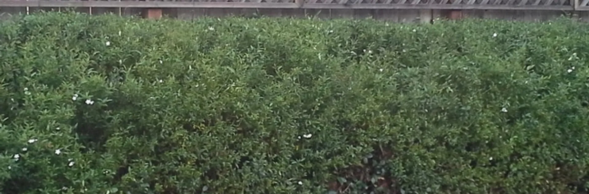 Today the fence looks great with the three-foot tall green foliage and white/purple flowers running along the retaining wall with the lattice above it creating the perfect screen. Also, I now use a battery-operated hedge trimmer to save my neck and shoulders from getting tired from all that hand clipping. No more ladders.