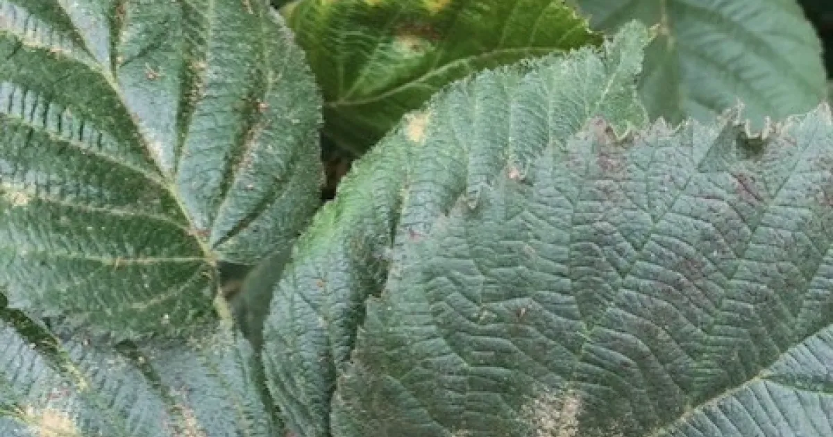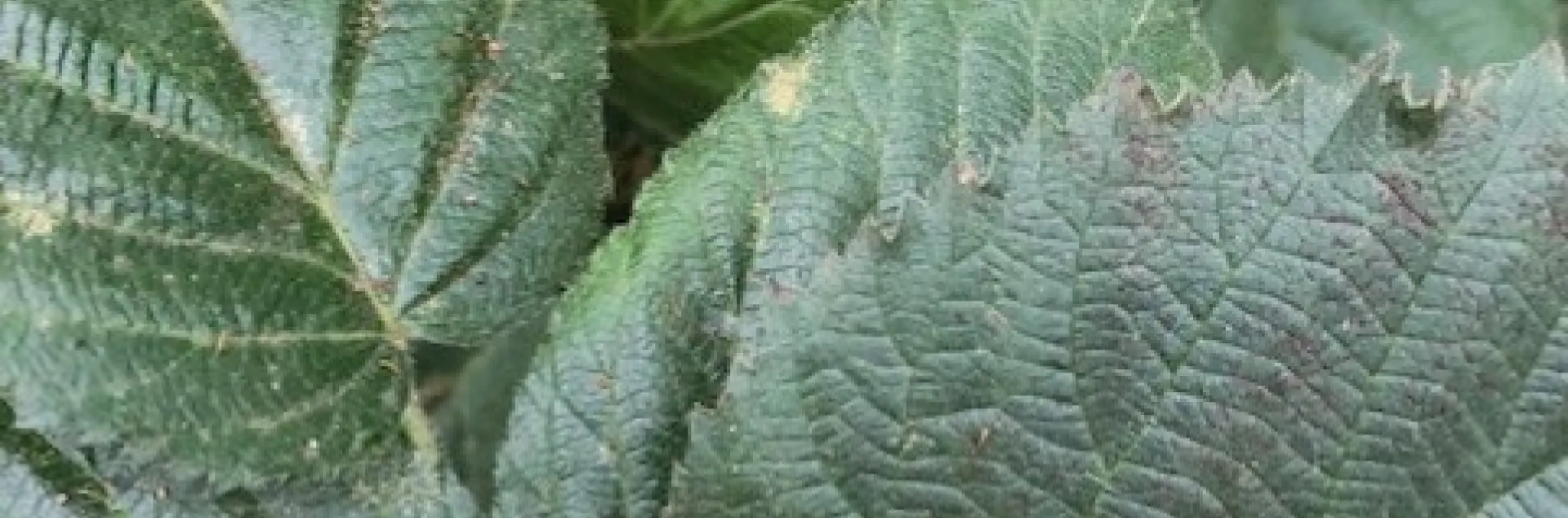 Here's one for all of you that I just can't figure out.  Symptoms (see Photo 1 below) are on fruiting primocane blackberry, under tunnels.  Maybe 5% of leaves affected, mostly limited to the bottom third of the hedgerow but issue does occur in bunches.  Temperature-wise, as you all know, we've had warm weather the week prior to this one.