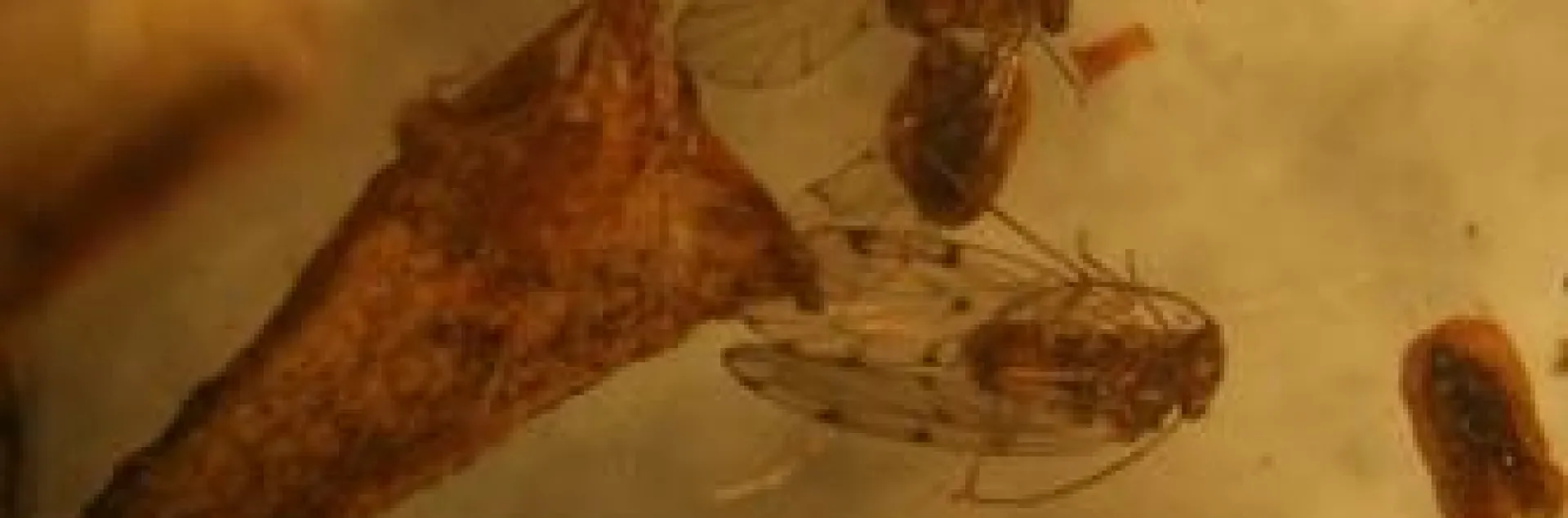 See picture below of what Kirsten and I are looking at, these little guys, between 4 and 5 mm in length, are known as psocids (pronounced SO-sids). They are actually not flies in the order Diptera, but rather belong to another insect order entirely, that being Psocodea. As you can see from the picture below, their wings are membranous, the bodies shortened and the head features rather lengthy antennae.