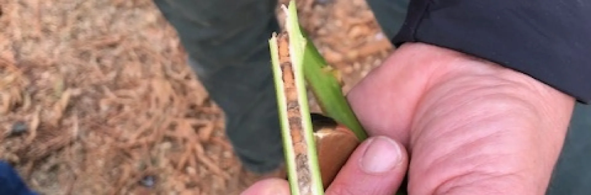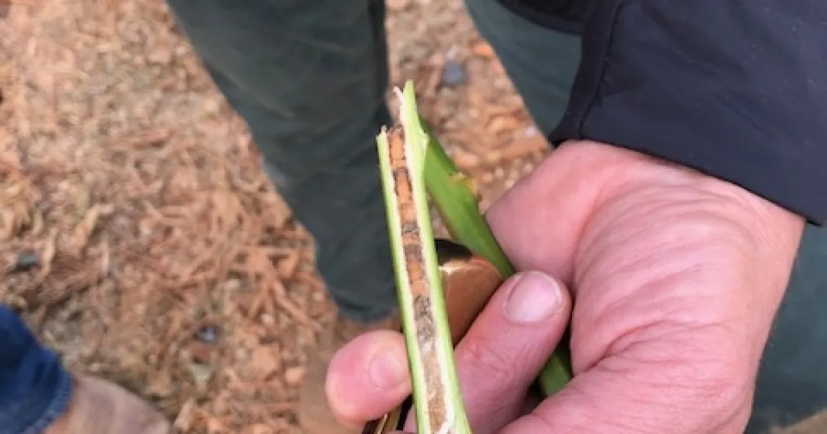 As one can see from the photo below, as is typical with these wasps the pith of the cane is hollowed out and the pupae lined up within. While this particular cane didn't seem to be dying back too much from this activity (since the vascular elements of the plant are in the surrounding stem and not the pith), it's still interesting to see this. As I've written before, these wasps are aphid feeders and their incidence in the field is sort of rare here (and hence cause for excitement with our group on their discovery!), I wouldn't consider doing control measures and indeed the grower echoed this.