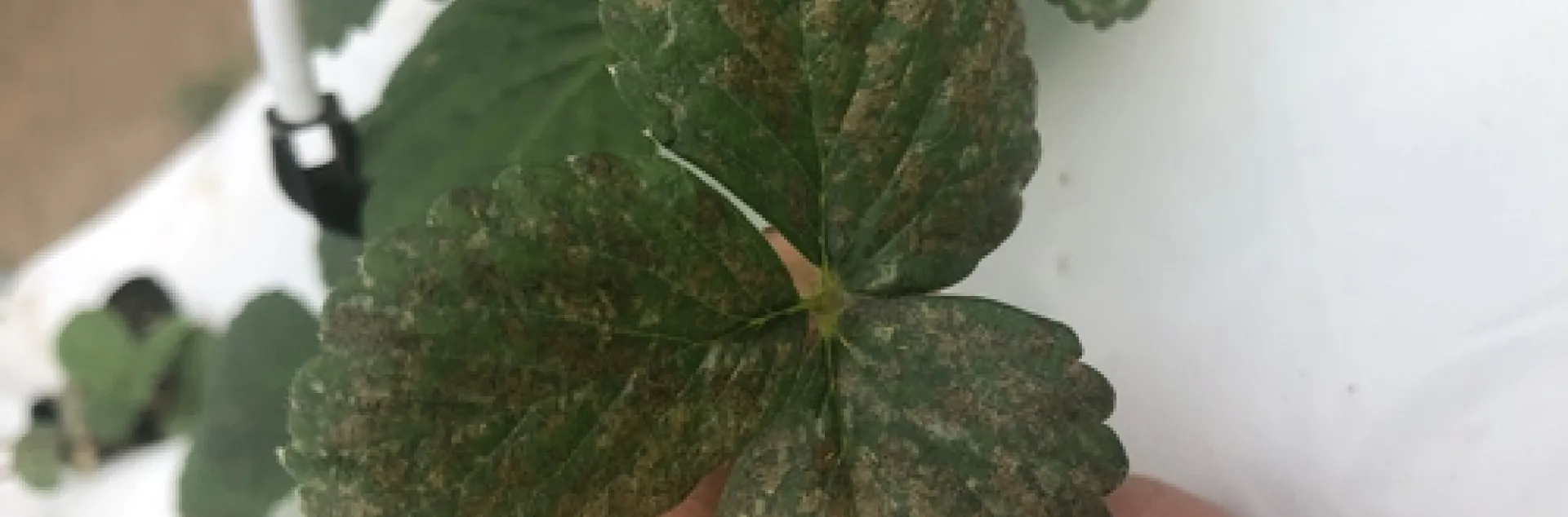 Already giving away the punchline in the title, but I was approached yesterday by a grower experiencing an unusual problem on his strawberries. All of this has been handled remotely, so on first glance I see drying out spots of various sizes and shapes on the leaves with dark spots in the middle of many of them (Picture 1 below). Problem tends to occur and be more severe on mature leaves. Pretty inconclusive, but the gut response would be a fungal disease with the dark spots being fruiting bodies of some sort.