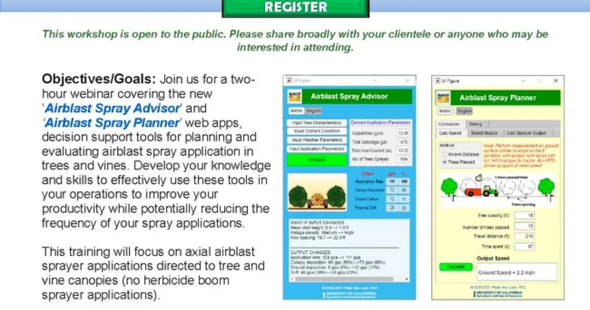 Join us for a two-hour webinar covering the new ‘Airblast Spray Advisor' and ‘Airblast Spray Planner' web apps, decision support tools for planning and evaluating airblast spray application in trees and vines. Develop your knowledge and skills to effectively use these tools in your operations to improve your productivity while potentially reducing the frequency of your spray applications. This training will focus on axial airblast sprayer applications directed to tree and vine canopies (no herbicide boom sprayer applications).