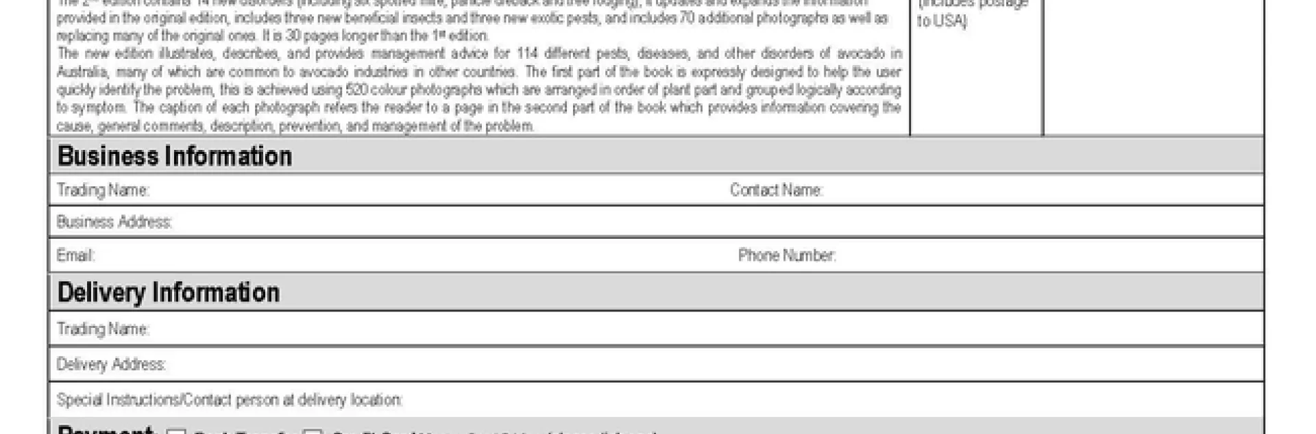 The new edition illustrates, describes, and provides management advice for 114 different pests, diseases, and other disorders of avocado in Australia, many of which are common to avocado industries in other countries. The first part of the book is expressly designed to help the user quickly identify the problem, this is achieved using 520 colour photographs which are arranged in order of plant part and grouped logically according to symptom. The caption of each photograph refers the reader to a page in the second part of the book which provides information covering the cause, general comments, description, prevention, and management of the problem.