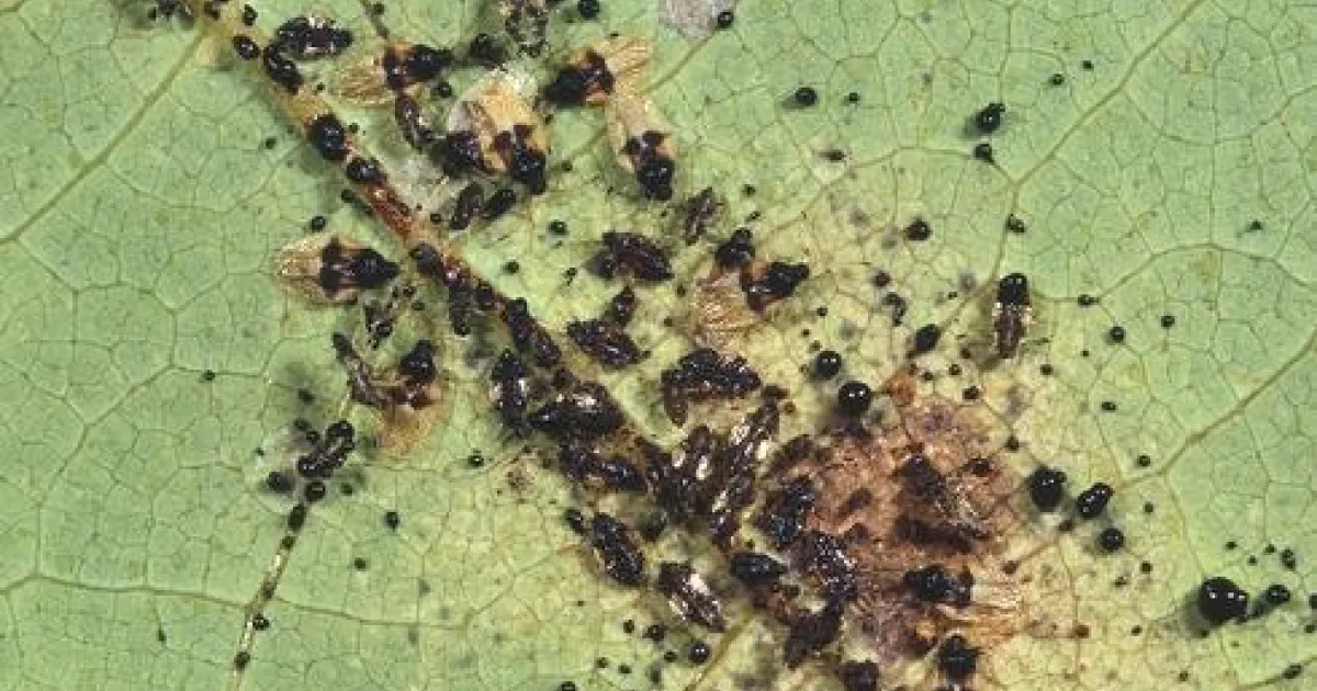 photo: Avocado lace bug, Pseudacysta perseae, adults, nymphs, and eggs under black excrement.
