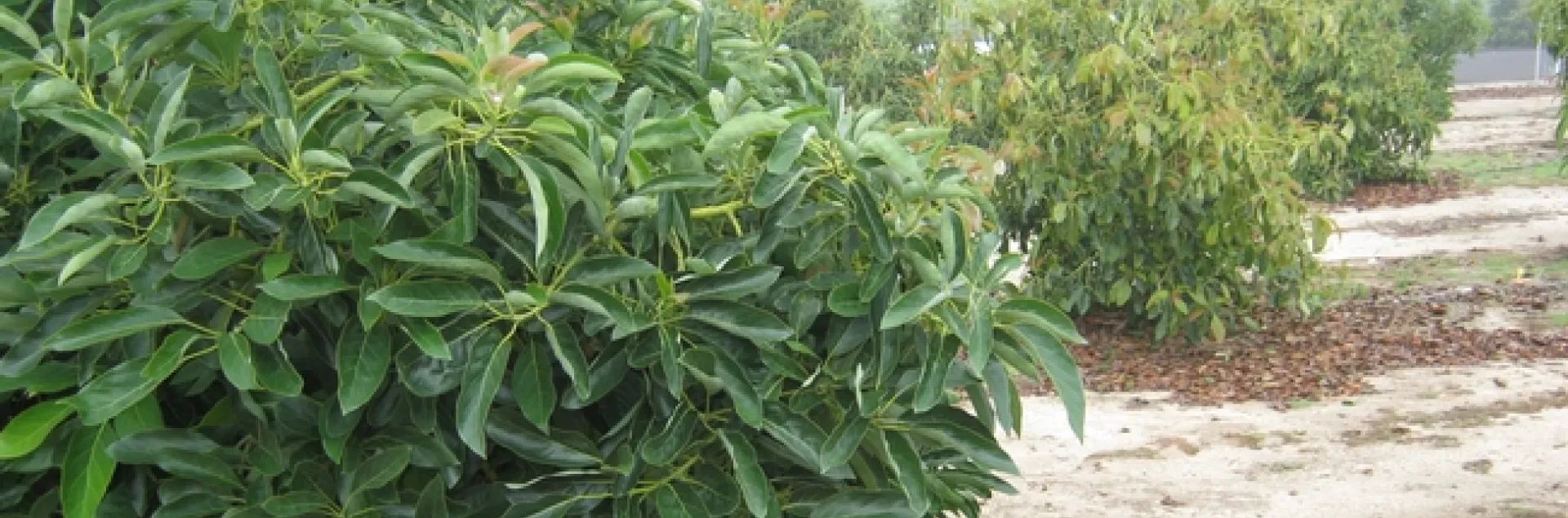 This stress sets up the trees for disease and a very common one in an avocado orchard that is filled with lots of leaves where decay fungi are working is stem and leaf blight. The disease causes defoliation and exposed fruit sun burn and drop. In an orchard, it's possible to see healthy trees and sick ones at the same time. This may be due to the differences in soil type from tree to tree or the fruit load on trees - more fruit, more stress. Looking out over the orchard there may be a polka dot of sick trees. And it might all happen at once in a week or gradually.