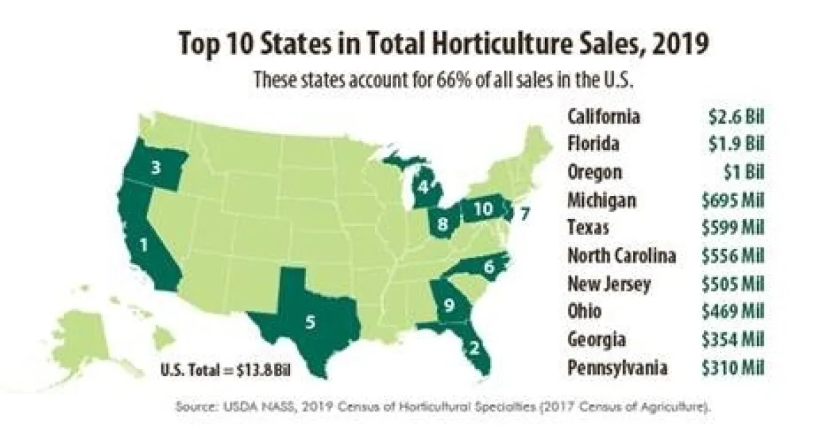 Horticulture production occurred primarily in 10 states, which accounted for 66% of all U.S. horticulture sales in 2019. California ($2.63 billion), Florida ($1.93 billion) and Oregon ($1.02 billion) led the nation in sales.