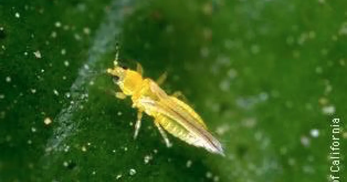 A close-up photograph of an adult citrus thrips (Scirtothrips citri). Credit: Jack Kelly Clark, UC IPM.
