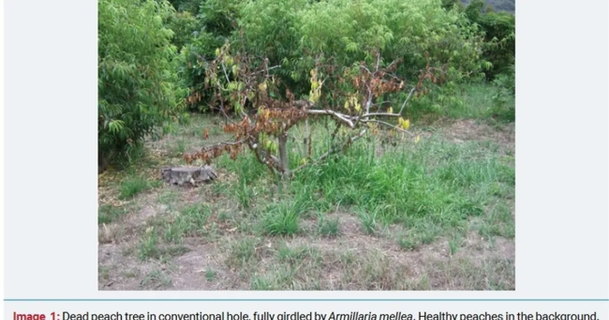 Peaches, Prunus persica were planted as grafted saplings in an avocado orchard previously infested with Armillaria mellea (Vahl) P.Kumm. Peaches were used because they are so sensitive to the fungus. Trees were planted in large or small holes withor without fresh yardwaste chips added as an amendment and with or without a Trichodermabiocontrol product sprayed into the hole. Trees were monitored for six years -- growth and mortality was tabulated. Six years later 40% of the trees had died from the disease. Trees planted in a large hole were more likely to survive than in a smaller hole (P=0.07) and trees in large holes with fresh organic matter added were the most likely to survive (P=0.04). Trichoderma sprays in the planting hole did not increase survival rates. While growth was initially retarded by adding fresh yardwaste to the hole, in later years none of the treatments affected growth rates
