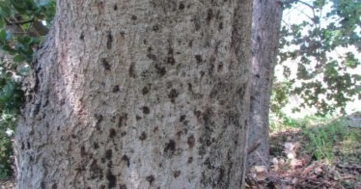 Symptoms of foamy bark canker disease include wet discoloration on the trunk and main branches of the infected coast live oak tree. This discoloration surrounds the entry holes that the western oak bark beetle makes to burrow into the tree. Multiple holes can often be seen on an infected tree.