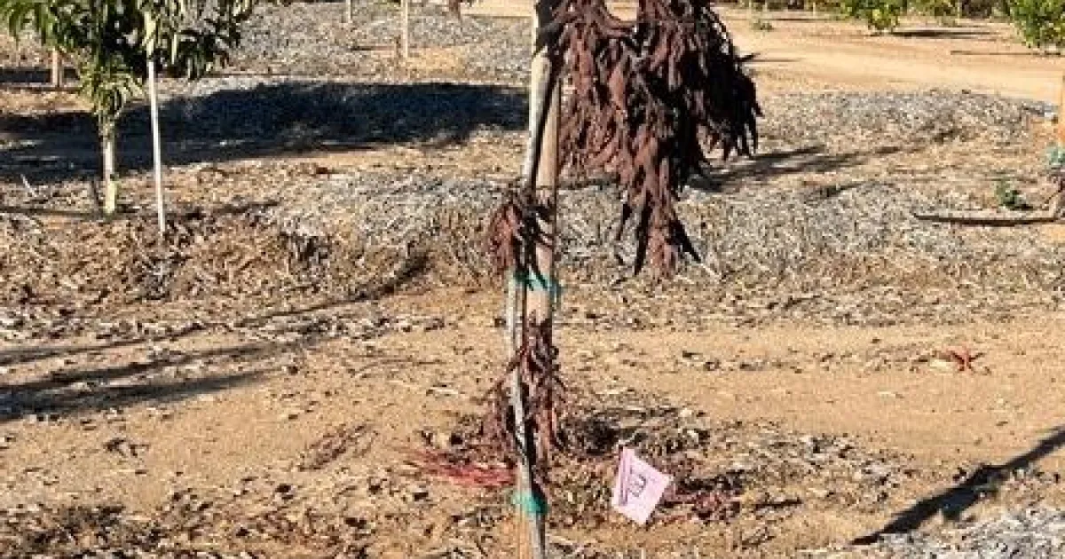 Red imported fire ant (RIFA), Solenopsis invicta, has been reported as a pest in Florida where the fire ants girdle young citrus trees (Diepenbrock) https://crec.ifas.ufl.edu/media/crecifasufledu/extension/extension-publications/2021/2021_jan_fireant.pdf Florida researchers found that RIFA girdled the trees and killed them. In the summer of 2022, we discovered newly planted avocado trees being girdled and killed in WHERE?. Upon closer examination we discovered the girdling was from the activities of a fire ant. Dr. Dong-Hwan Choe, Professor of Extension – Entomologist at UC Riverside, identified it as Solenopsis sp. Figure 1 show the initial damage to an otherwise healthy avocado tree which weeks later was completely girdled and dead. Fire ants were controlled using a bait. This took 2 applications. Fire ant mound is evident in Figure 1B but is not the typical mound that is associated with fire ants so growers need to be watching for ant activity and treat proactively. The fire ants were very aggressive to both the tree and the people working the trees.