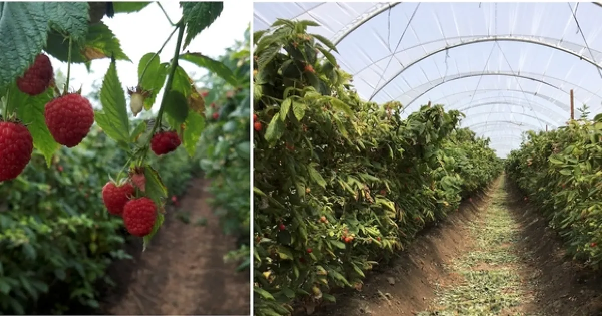 Raspberry (Rubus spp.) is an important crop for California, where it is among the top 20 commodities with an average annual value of $448 million from 2015 to 2017 (CDFA: California Agricultural Statistics Review 2017-2018). This represented 82% to 88% of the domestic raspberry production. The four California counties where raspberry is produced are Ventura, Santa Cruz, Santa Barbara, and Monterey. Specifically in Ventura and Santa Cruz counties, raspberries are among the top commodities (California Agricultural Statistics Review 2017-2018). On the West Coast of the United States, raspberry is typically produced in two stages from a single planting that is grown for a maximum of two years. In the primocane stage or first year cycle, harvest generally begins five months after planting of bare root transplants and continues for approximately three months. After harvest, the primocane growth is pruned near the last fruiting lateral or is mown at the soil line. The growth that follows this pruning begins the floricane stage or second cycle, which has a harvest period that generally begins three months after pruning and can last approximately two months (personal communication Jose Gomez, Driscolls). Fresh market raspberry production in Ventura County is commonly grown on 3 rows of densely-planted raspberries under one plastic hoop tunnel (Figure 1). Raspberries are grown under protected structures, plastic covered high-hoop tunnels to extend the production season and to protect the delicate fruit from direct sun or rain/fog damage. In Ventura County, a crop can be planted during four periods throughout the year: early spring, late spring, mid-summer, or late summer. Main production challenges include limited availability of farm workers, Phytophthora root rot, Yellow rust, Botrytis fruit rot, Spotted wing drosophila, and Two-spotted spider mites (UC IPM online). In 2018, the raspberry industry in Ventura County produced 64,736 tons on a little over 4,000 acres (Ventura County's 2018 Crop and Livestock Report).