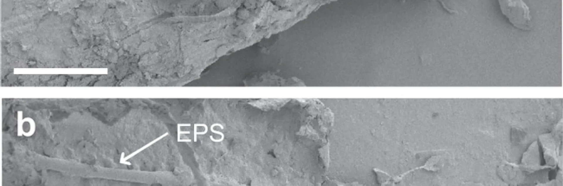 Scanning electron microscopy (SEM) images of the interface of plant litter (POM) and soil minerals, where soil minerals are (a) attached to the litter surface (scale bar = 100 µm) and (b) enmeshed with fungal hyphae and extracellular polymeric substances (EPS; scale bar = 10 µm). Similar images were obtained from at least 10 independent locations in each soil texture.