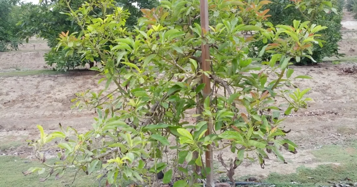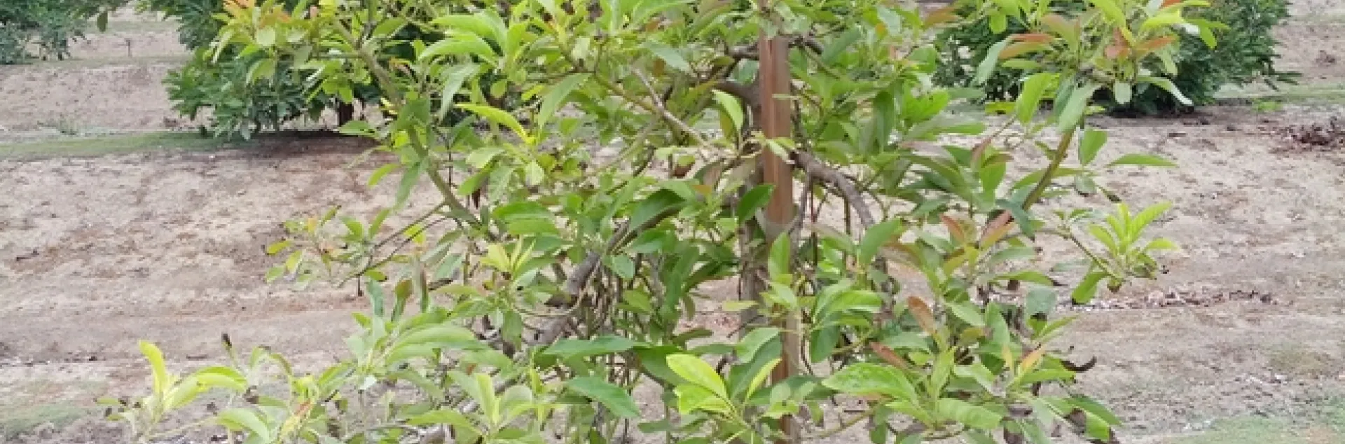 Iron chlorosis is an off duck.  Soil is basically iron with some aluminum, silicon and oxygen added in for good measure, but plants can lack for iron because it is not available to be taken up.  This is often because the soil pH is high due to carbonates which tie up the iron, causing it to precipitate.  Another cause is asphyxiation of the roots from too much water.  Avocados are especially sensitive to asphyxiation and will show classic interveinal chlorosis and as time goes on, the leaf will turn almost white.   They will also show tip burn, like chloride damage in some cases, along with the yellowing.  The image of the tree below is of an avocado in a loamy soil with a pH near 7, but is irrigated every two weeks with about 400 gallons of water – kind of boom and bust.  The trees are drowning and showing classic iron chlorosis symptoms, but they could also be confused with root rot.